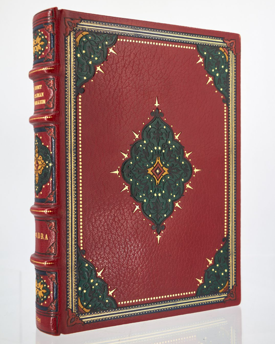 Half almond-green morocco binding with corners, faded spine with three raised bands, gilt date at foot, boards marginally faded, marbled paper boards, endpapers and pastedowns, original wrappers and spine preserved, contemporary binding signed F. Hauttecoeur.