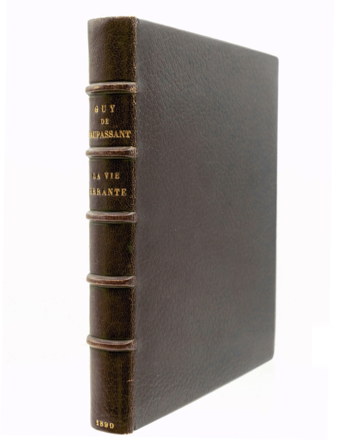 Full midnight blue morocco binding, spine with four raised bands, date gilt at tail, gilt roulettes on headcaps, framing of quadruple gilt fillets on brown morocco doublures enhanced with green almond mosaiqued morocco pieces forming rectangles and, at corners, blue, green almond and red mosaiqued morocco pieces embodying stylized floral motifs, painted silk endpapers representing a scene of Flemish life for the first: fishermen's wives waiting on the shore for the return of a fishing boat framed by rich decoration of stylized floral motifs; for the second: a tree-lined quay of a village on the riverbank in the foreground and, in the background, a windmill with its sails raised to the wind, following endpapers of marbled paper with moiré and gilt effect, covers and spine preserved, all edges gilt, points and fillets on edges, slipcase bordered with midnight blue morocco, mustard felt interior, boards of moiré effect paper, chemise in half midnight blue morocco with bands, boards of moiré effect paper, elegant mosaiqued binding of the period signed G. Levitzky.