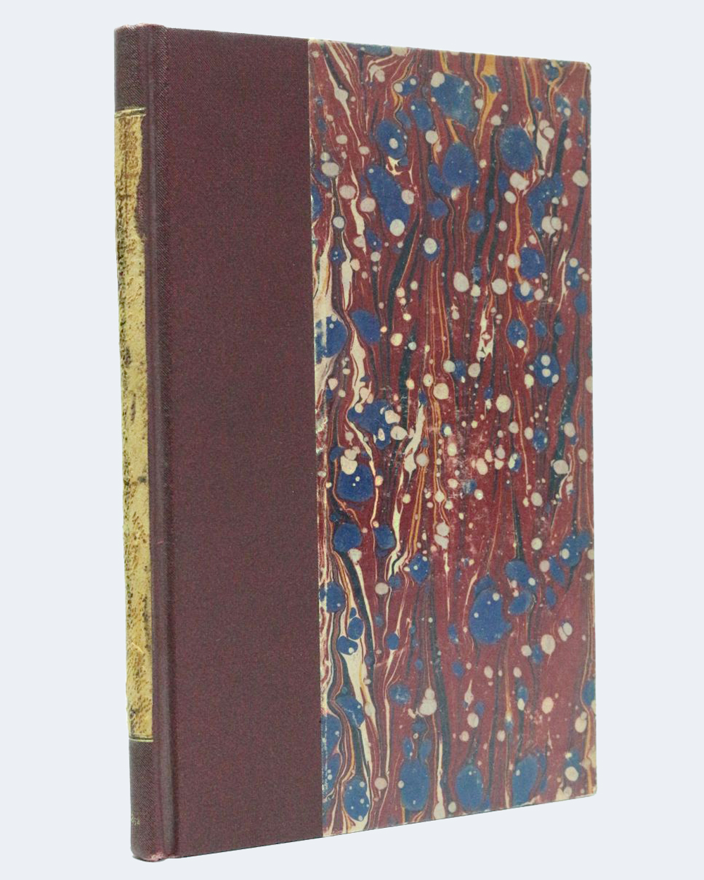 Bradel binding in burgundy half-cloth, smooth spine, rubbed tawny shagreen title-label, date gilt at foot, marbled paper boards, original wrappers preserved, top edge gilt, binding stamp-signed in blind Guellier.