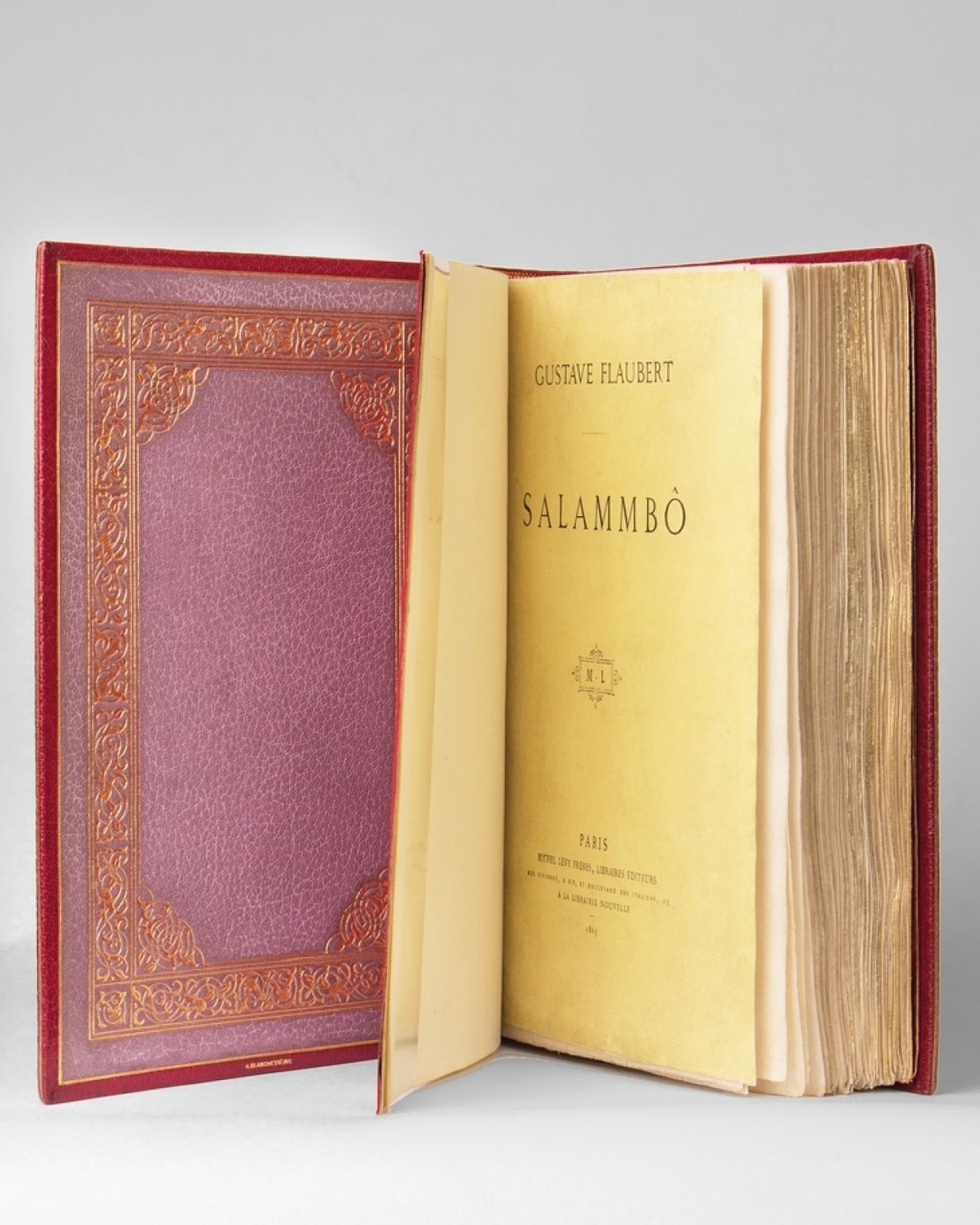 Full burgundy morocco binding, spine with four raised bands decorated with a fasces of the lictor in red morocco mosaic set within gilt fillets, date and place gilt at foot, gilt rolls on the caps, front cover ornamented at center with a circle enclosing a Phrygian cap in red morocco mosaic framed in gilt, radiating gilt fillets filling the circle, the rear cover with the same decoration but replacing the revolutionary cap with a red morocco mosaic Masonic triangle and gilt plumb-line, triple gilt fillet borders and inlays of blue, white, and red morocco panels on red morocco doublures, moiré silk endpapers in red, additional marbled paper endpapers, original wrappers and spine preserved, all edges gilt, slipcase trimmed with burgundy morocco, sides in matching paper, grey felt lining, a superb contemporary mosaic binding signed Blanchetière.