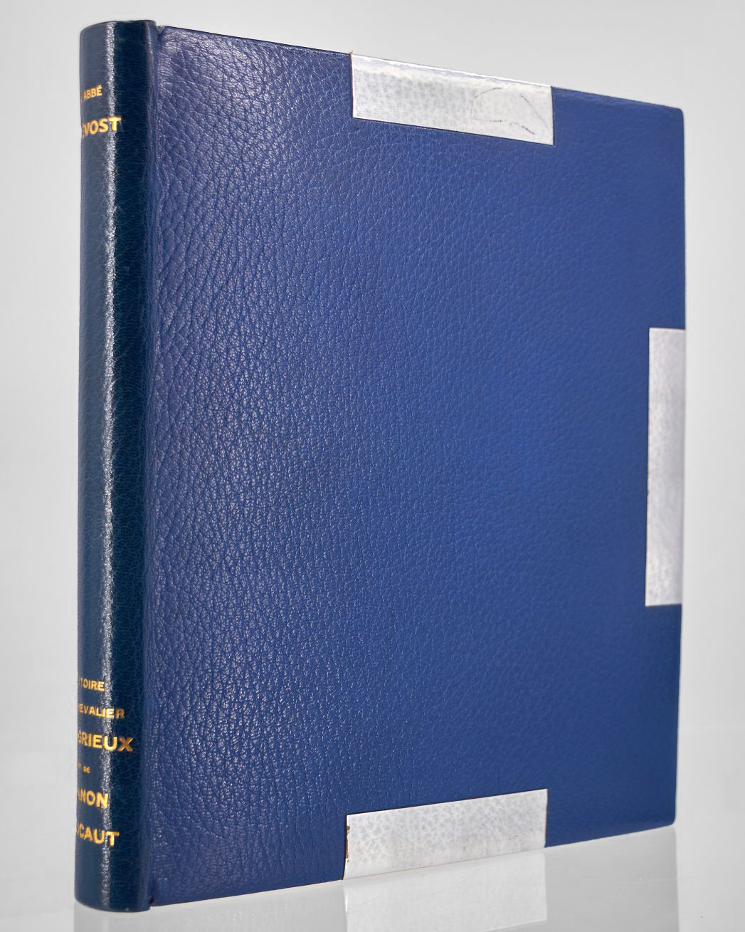 Full France blue morocco binding, smooth spine, covers decorated with silver-colored paper plates on three sides, France blue morocco enhanced with a septuple gilt fillet with return of the silver paper plates framing three sides of the pastedowns, the latter and endpapers of marbled paper, original covers and spine preserved, top edge gilt on deckled edges, slipcase bordered with blue morocco, binding signed by J. Van West.
