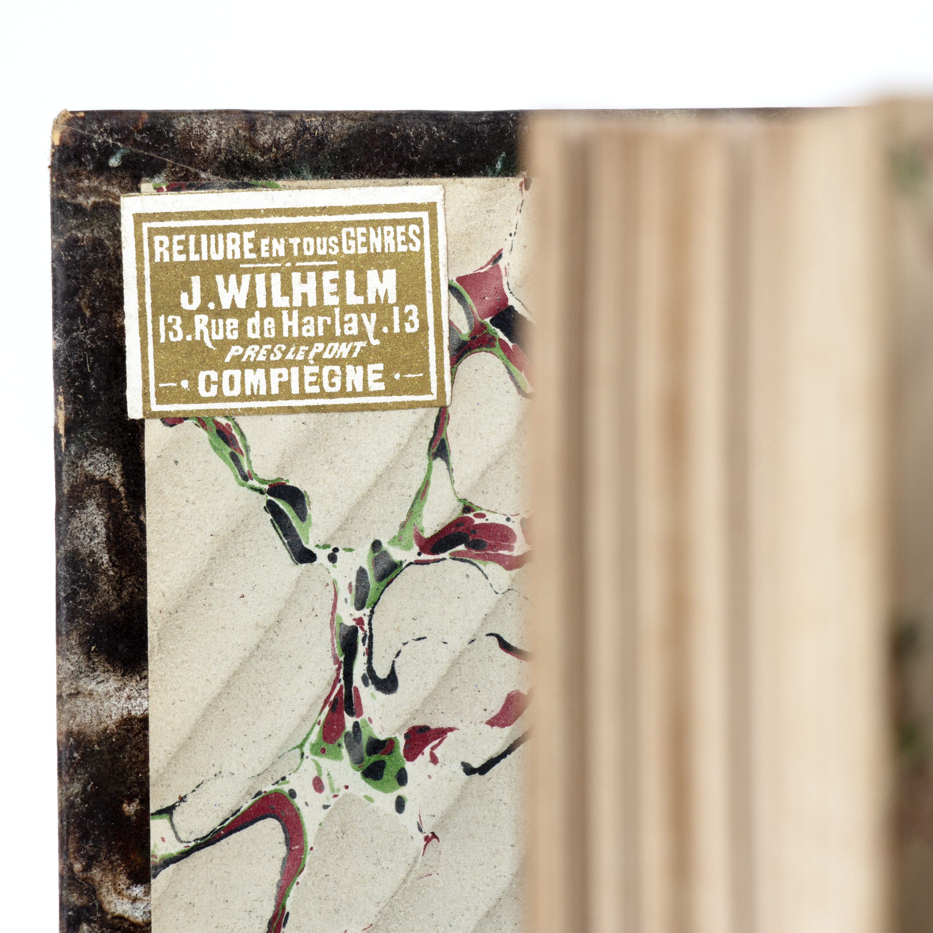 Half chocolate shagreen binding, spine with five raised bands decorated with gilt fleurons, small traces of rubbing at head of one joint, marbled paper boards, marbled endpapers and pastedowns, binding signed by J. Wilhem relieur à Compiègne.