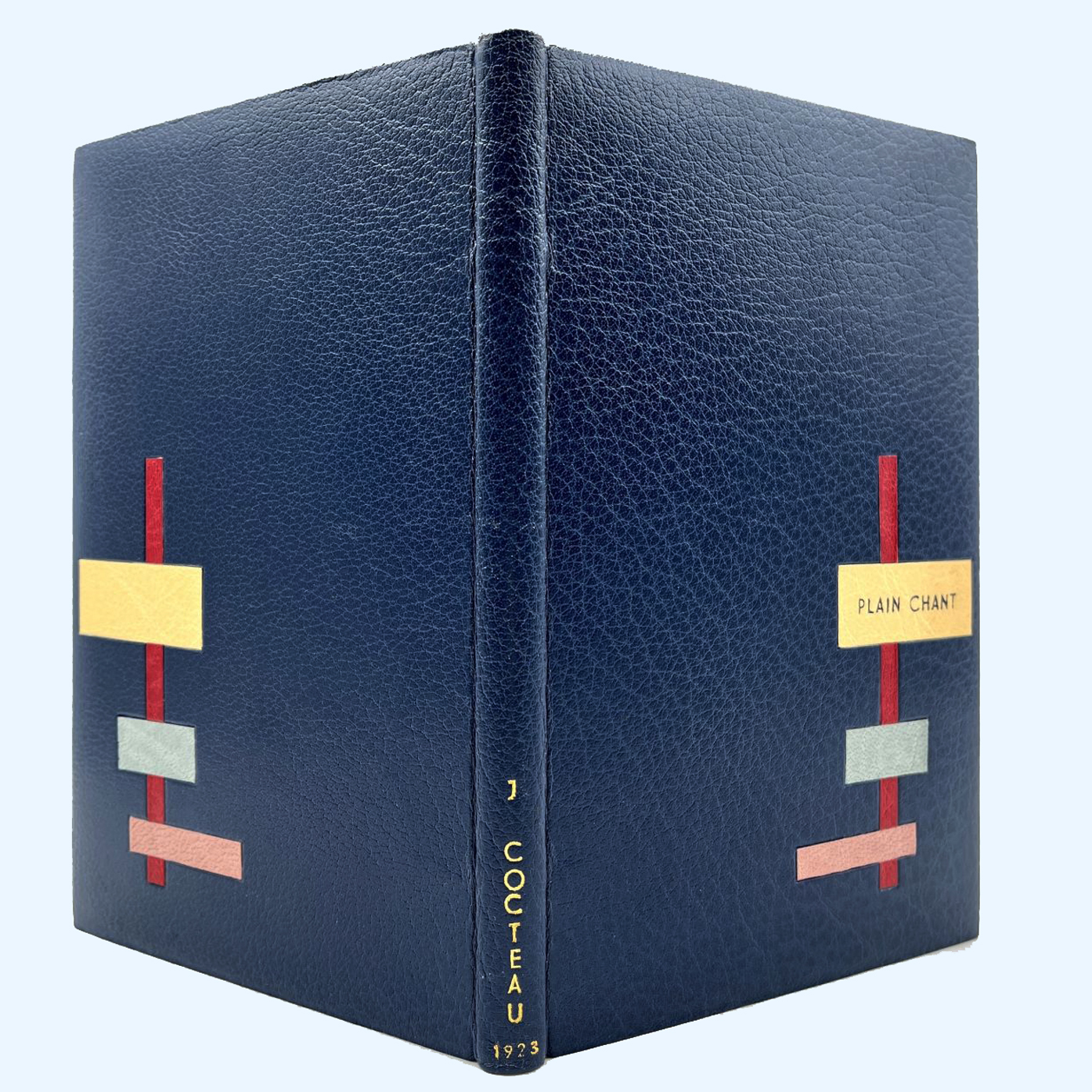 Full bright blue morocco binding with mosaic decoration signed at the bottom of the slipcase by Jadis. Marbled paper slipcase, matching the endpapers. Smooth Jansenist spine with author's name in full. Boards with mosaic decoration featuring a red fillet crossed by 3 rectangles in cream, grey and pink; title in black on the cream cartouche. Original pink wrappers preserved.
