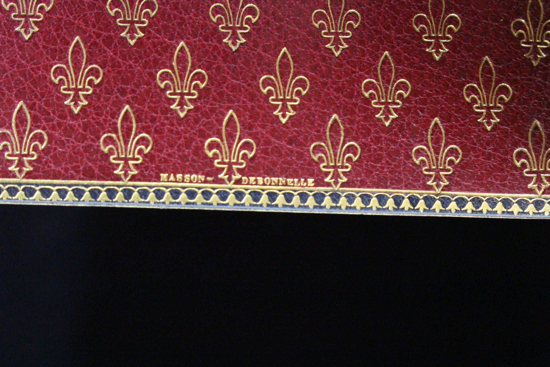 Full black morocco binding, spine with five raised bands, gilt roulettes on headcaps, frame of gilt frieze on full red morocco doublures decorated with gilt fleur-de-lys pattern, marbled endpapers, double gilt fillets on edges, all edges gilt, superb contemporary full morocco binding with doublures signed by Masson-Debonelle.