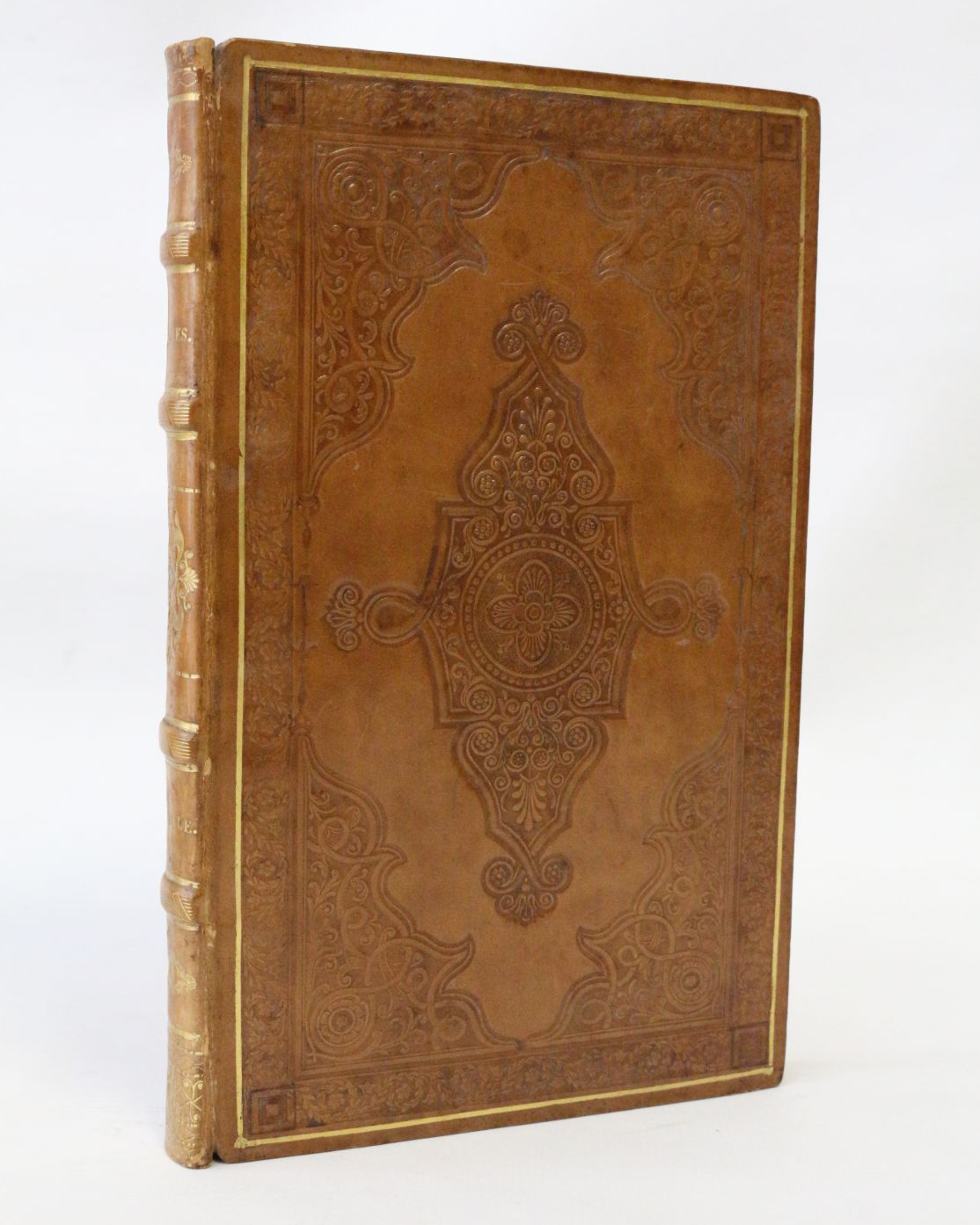 Half caramel morocco bindings, spines with one large raised band decorated with black romantic cartouches, marbled paper boards, marbled endpapers and pastedowns, marbled edges, three corners slightly bumped, contemporary romantic bindings signed by Meslant at foot of spines.