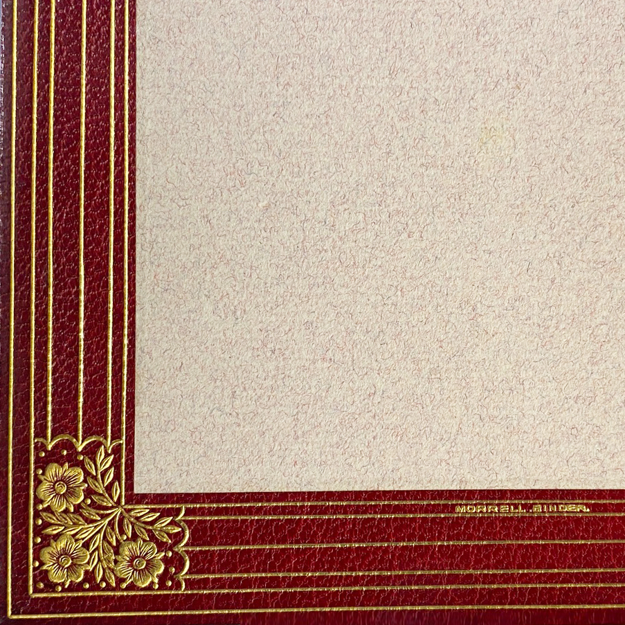 Full burgundy morocco binding, spine with five raised bands, gilt initials and date at foot, gilt roulettes on headcaps, gilt fillets on leading edges, frame of a burgundy morocco fillet decorated with sextuple gilt fillets on endpapers, pink paper endpapers and pastedowns, wrappers preserved, top edge gilt on deckled edges, bookplate pasted to verso of front board, contemporary English binding signed by Morrell.