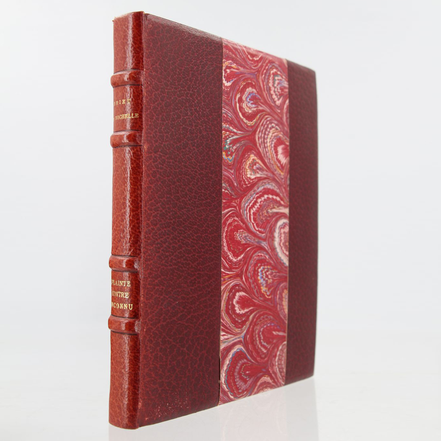 Half burgundy morocco binding with bands, spine slightly faded with four raised bands, marbled paper boards, endpapers and pastedowns, slightly soiled covers and sunned spine preserved, top edge gilt, signed binding by Myriam Lambert.