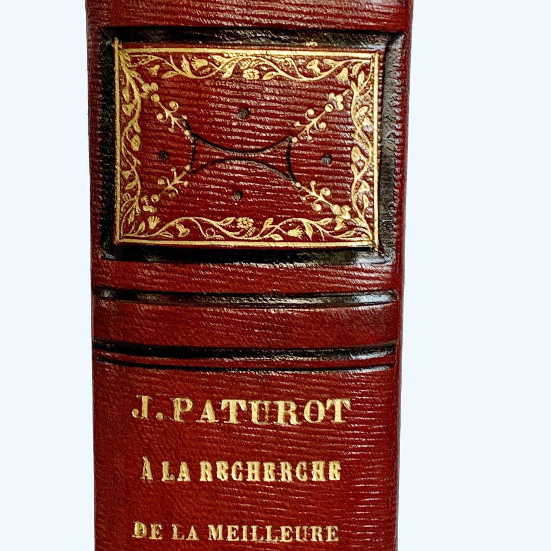 Half old-red straight-grained morocco binding, near-contemporary, signed on the first marbled endpaper by Prosper Charon. Spine with flat false raised bands decorated with ornate compartments with black framing around the compartments and emphasizing the bands. Elegant binding. Rubbing to boards, edges and corners. Scattered foxing, mainly in the margins, on good white paper.