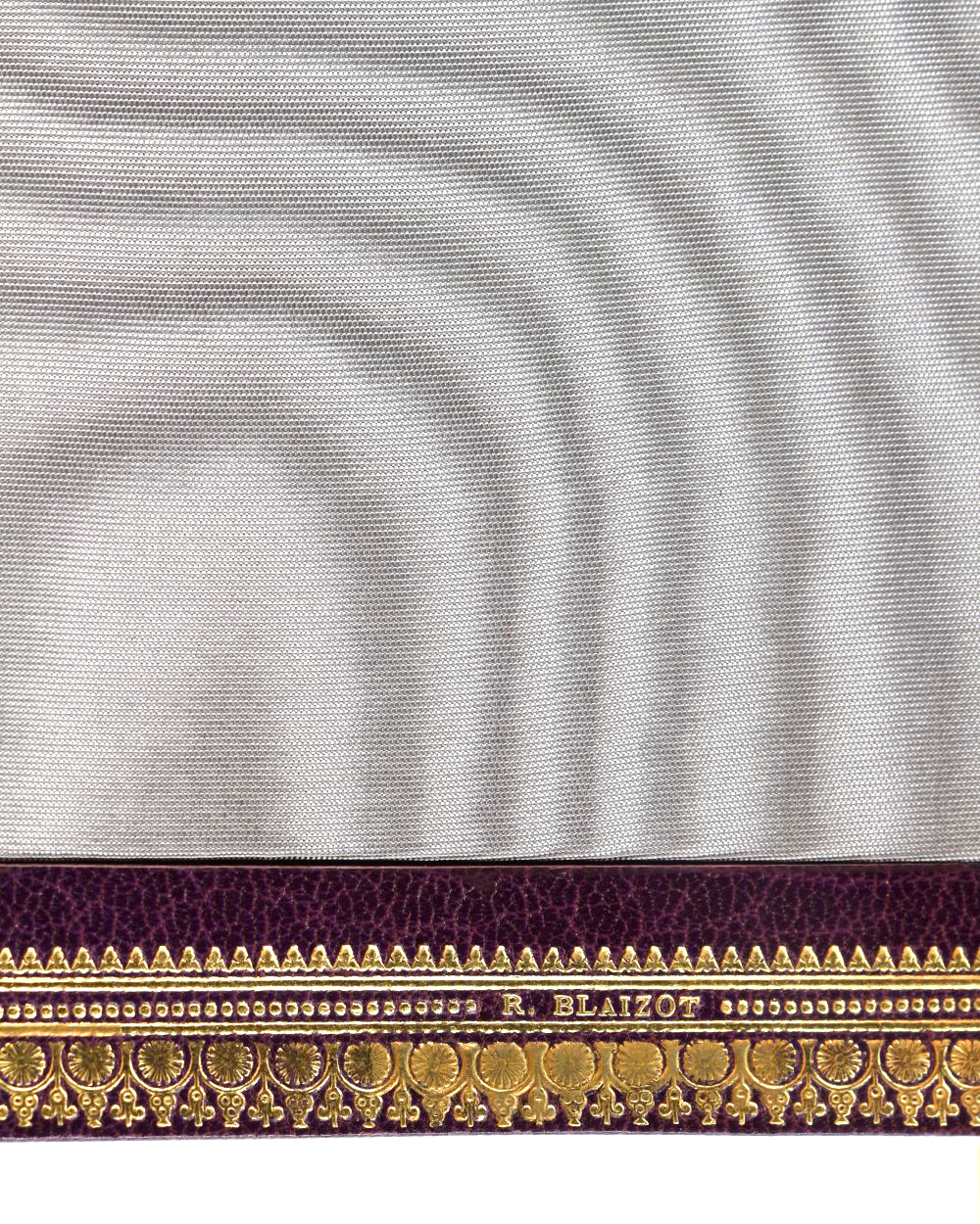 Full aubergine morocco binding, spine faded with four raised bands and bearing slight scratches, gilt date at foot, gilt roulettes on endpapers, double gilt fillets on edges, frame of wide gilt dentelle and aubergine morocco fillet on endpapers, endpapers and pastedowns of mouse-colored moiré silk, covers and spine preserved, all edges gilt; slipcase edged with matching morocco and mouse-colored felt interior, elegant binding signed by R. Blaizot. Work illustrated with an original drypoint by R. Drouart as frontispiece.
