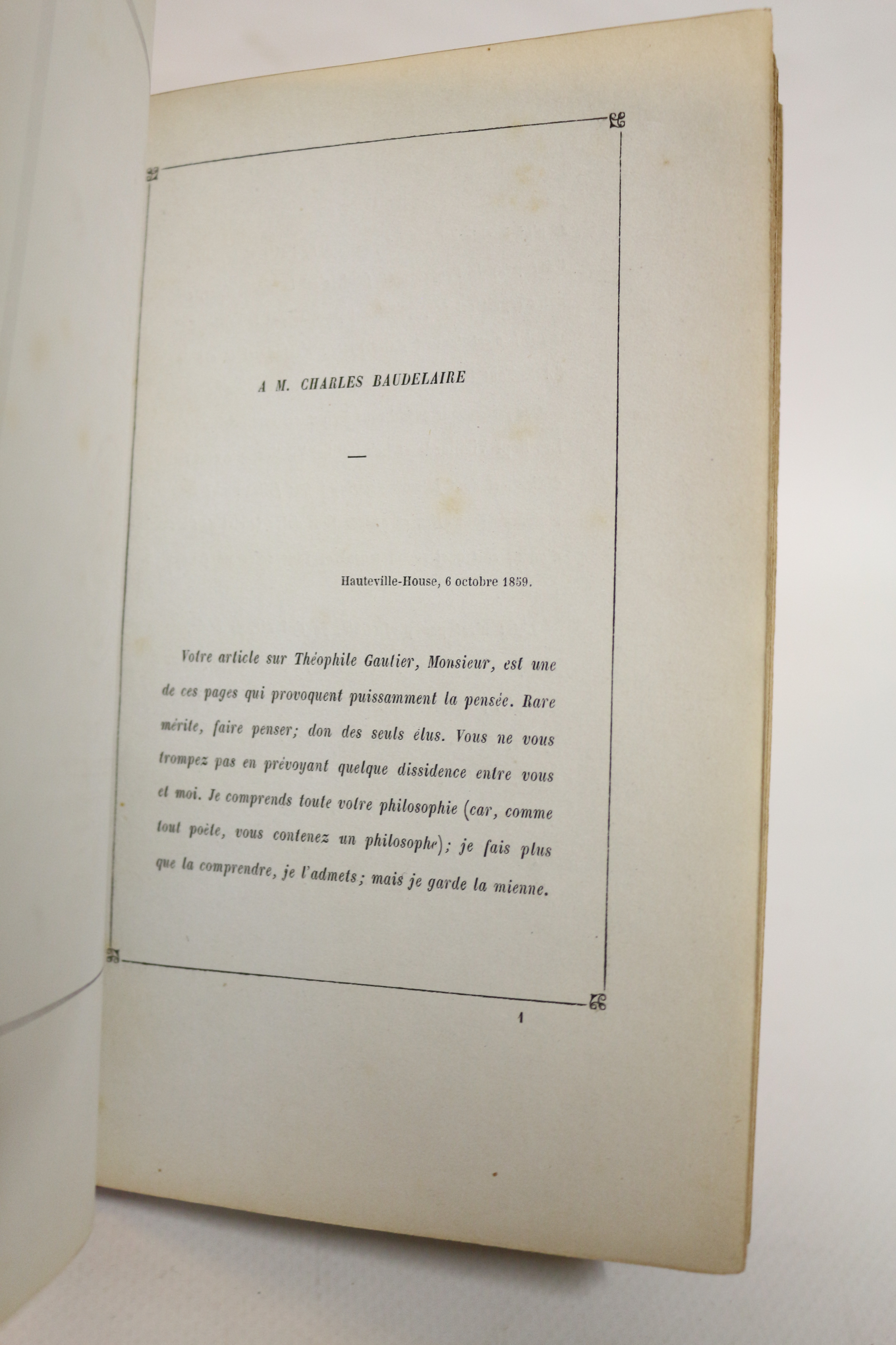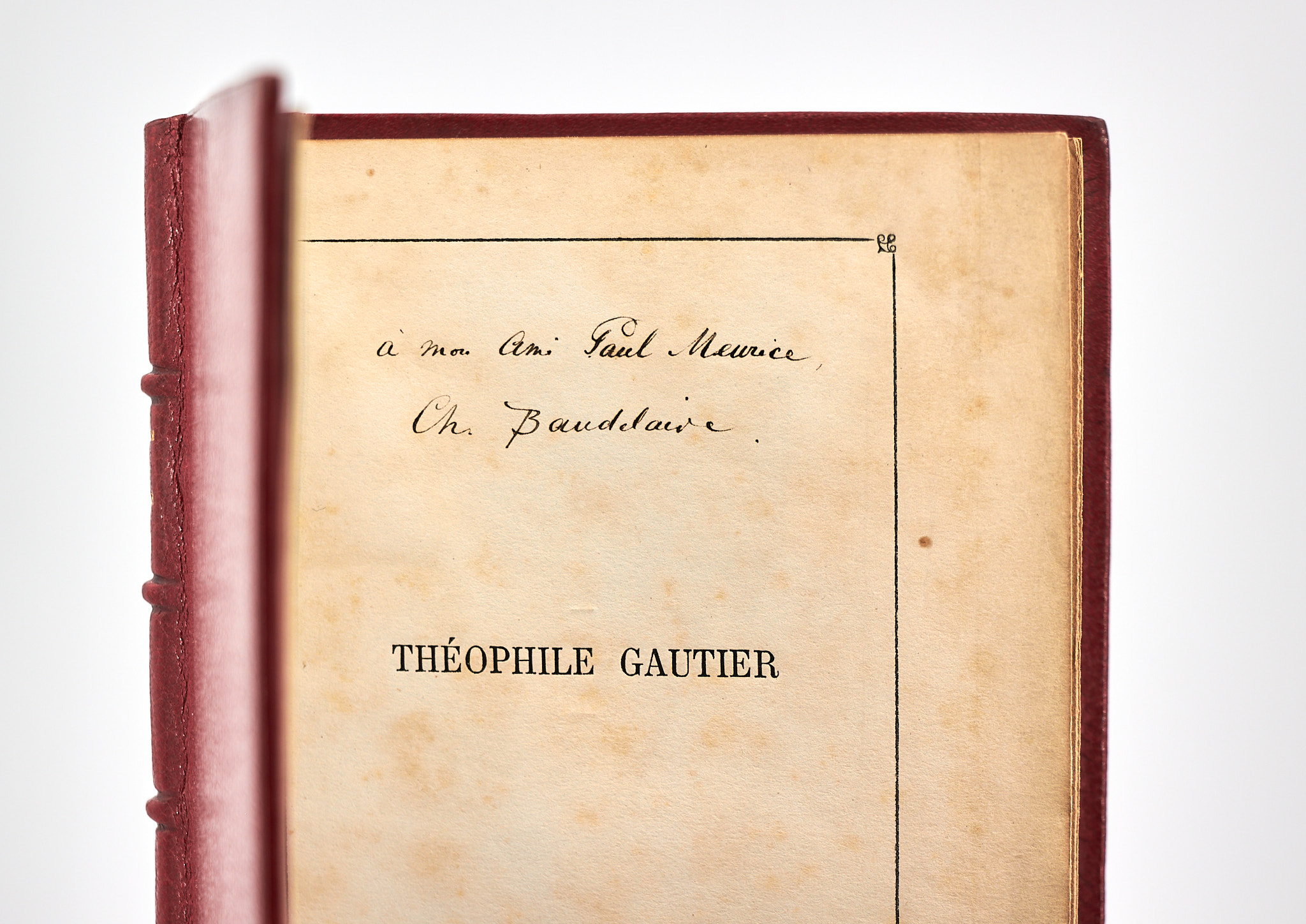 Two years after The Flowers of Evil, Baudelaire confidentially published a "literary notice" on Gautier for which he obtained a preface letter from Victor Hugo. Under its appearance of simple panegyric of the impeccable poet, this unique literary collaboration is the place of a major ideological fight between the two immense poets who sign here their respective manifestos: that of the art for the art against that of the art for the progress. Discover, through this exceptional copy offered to Paul Meurice, close friend of the two giants, the story of this tempestuous meeting between the Albatross and the Ocean Man. Rare handwritten inscription signed by Charles Baudelaire: “ à mon ami Paul Meurice. Ch. Baudelaire. ” (“To my friend Paul Meurice. Ch. Baudelaire.”)