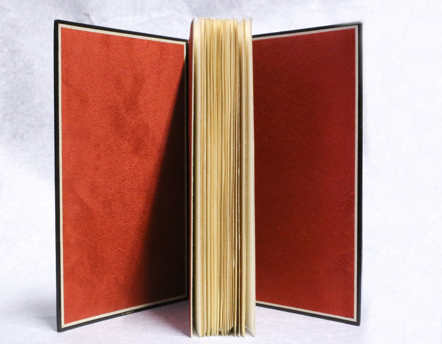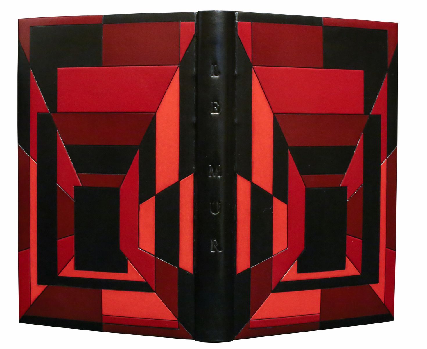 Binding full box black, smooth back titrated cold to the Chinese dishes covered with a geometric perspective mosaic decoration of red, orange and burgundy box pieces, black box framing the contreplats, guards and contreplats burgundy suede, all slices gilded, blankets and back preserved, black half-box shirt with strips on pink old wooden paper, pink old paper case lined with black box, binding signed by C. and JP Miguet, 1985.