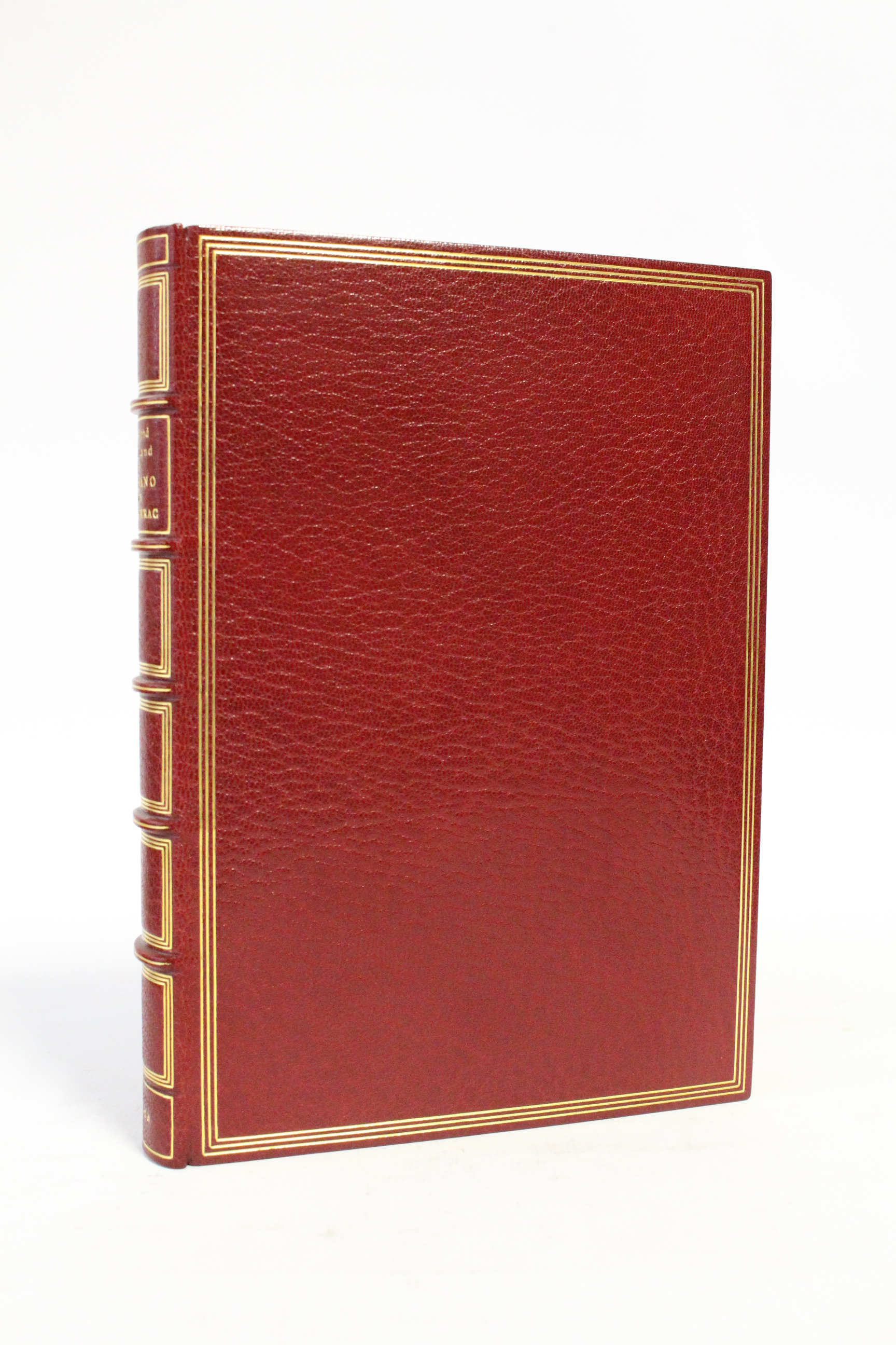 Bound in full morocco burgundy, smooth back, dishes decorated with a mosaic geometrical decoration composed of pieces of box wine lees and vellum burgundy varnished calf ending on the back, guards and contreplats of beige suede, all golden slices and golden head on witnesses, blankets and back preserved, shirt-case bordered in Bordeaux half-morocco, marble paper plates, burgundy and beige suede interior, elegant and beautiful binding signed by Colette and Jean-Paul Miguet. The case made by two great masters of contemporary binding is undeniably the most beautiful of all. ( See full description )