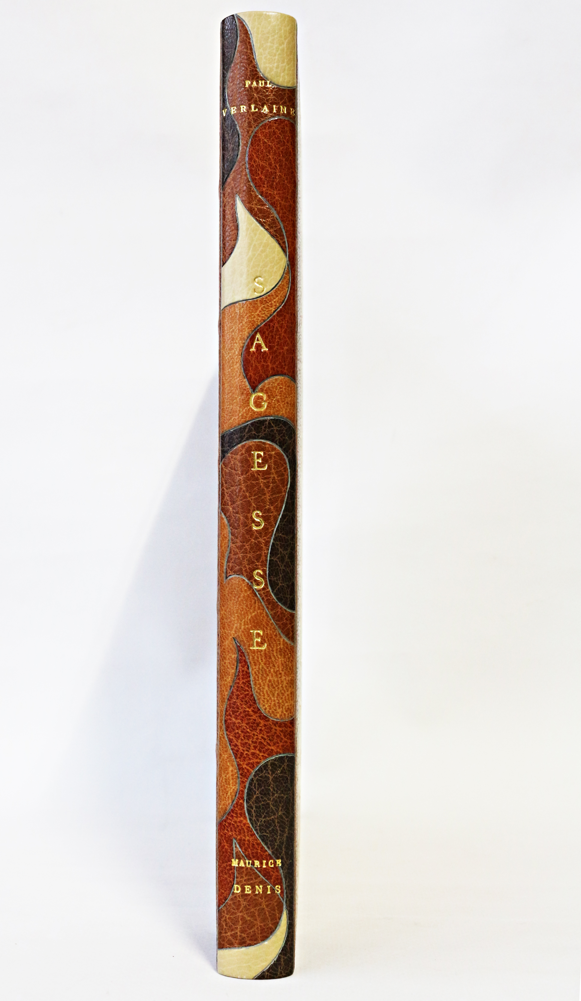Illustrated edition of 72 original compositions (frames, chapter heads and lamp-ends) including 72 in color by Maurice Denis, one of 210 numbered copies on Holland. Binding half morocco caramel bands, smooth back decorated with wavy arabesques edged with gray nets and mosaics pieces of morocco havana, lavallière, brown and cream, golden name of the illustrator tail, gray nets in frames of paper plates marbled, brown paper contreplats, covers and back preserved, golden head, case bordered of caramel morocco, marble paper plates, beige felt interior, binding signed Miguet. Very nice copy of this important artist's book particularly representative of the Nabi period of Maurice Denis, "the one where its freshness of invention combines with a symbolist invoice to give a pure note of its own" (cf François Chapon, The Painter and the Book, 1870-1970, pp. 68-72.) Beautiful copy of this important artist's book in an elegant Miguet mosaic binding. (See complete description )
