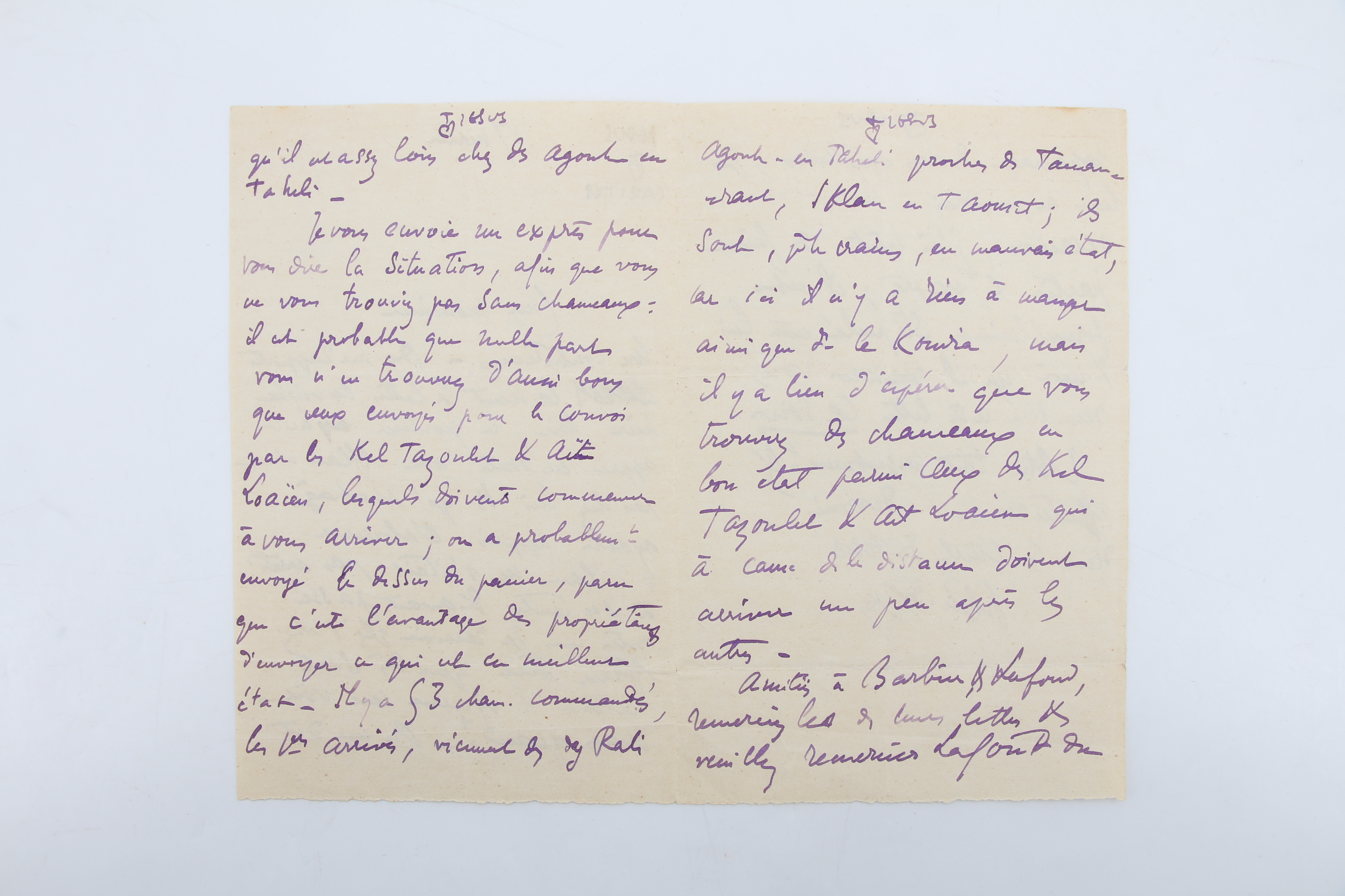 Superbe lettre d'un humble servant de Dieu qui sera canonisé en 2022, où figure sur chaque page son immortel symbole de l'amour avec lequel le Christ a aimé l'humanité - brodé sur sa tunique, il précédait également chacune de ses méditations, lettres ou écrits. Ces lignes pleines de bonté offrent un exceptionnel témoignage de son dévouement et de sa profonde connaissance du Sahara et de ses habitants.
