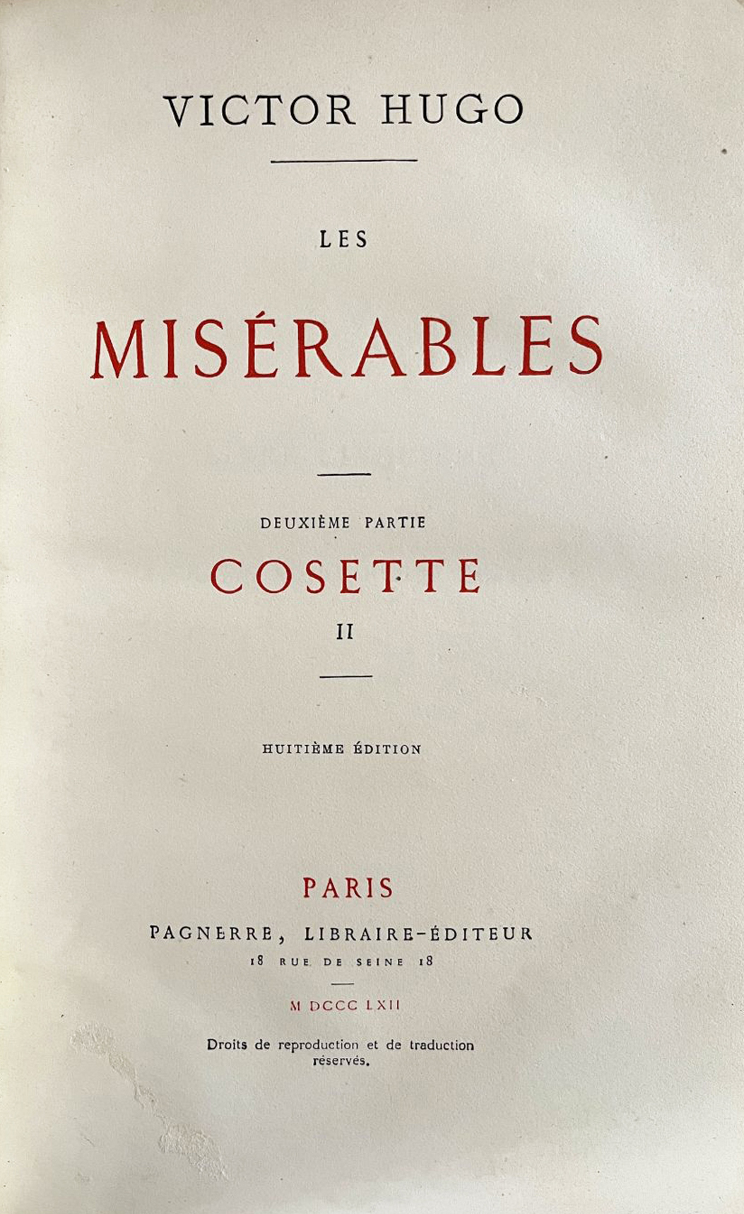 The first edition of Les Misérables was legally created by three different publishers, Pagnerre in France, Lacroix in Belgium and Steinacker in Germany, under the aegis of the official publisher A. Lacroix, Verboeckhoven & Cie.The question of the prevalence of one edition over the other, between the two first edition published on 1862, April, 3, in Bruxelles and Paris simultaneously, has long stirred the bibliophilic world and bibliographers remain divided on this thorny issue. Carteret and Vicaire, for example, ensured that the Paris edition should be preferred, whereas Vanderem and Clouzot placed the Belgian edition first. More than just a matter of chronology, this bibliographical dispute reveals the complexity of the concept of the first edition and the symbolic importance its holds for literary history and, in particular, for this masterful work which is among the most important in world literature.