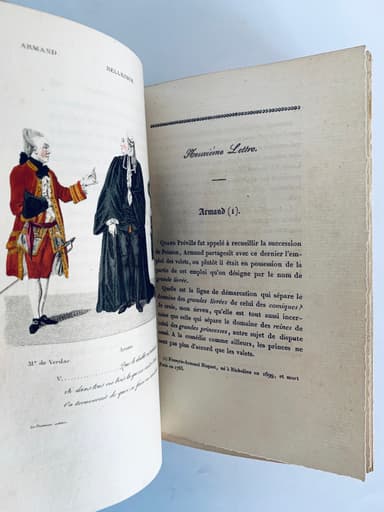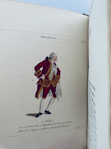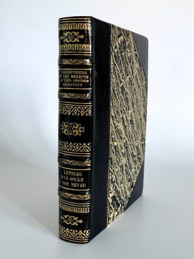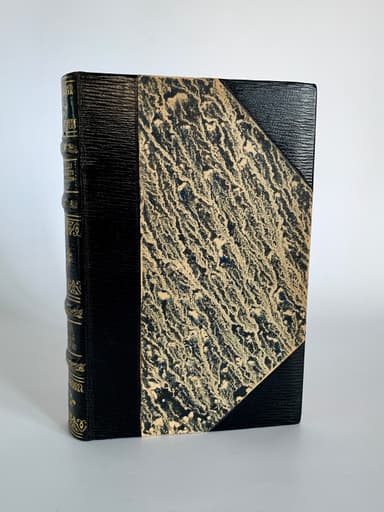 First edition illustrated with 36 hand-painted color plates with gold highlights Half black morocco binding with long grain from the late 19th century. Spine with raised bands richly decorated with 3 stamps and Restoration-style ornaments. One corner rubbed. Paper uncut. Very handsome copy, fresh Henry Houssaye bookplate. Remarkable illustration of theatrical costumes. At the head of the work are placed full-length portraits of the "greatest poet and greatest actor of the era," Voltaire and Lekain, shown rehearsing a scene from Mahomet. All illustrations are by Foech. "Engraved after gouaches of the smallest proportion, they are nonetheless of the most singular resemblance. Wirsker, author of these gouaches, reproduced with the most spirited exactitude the physiognomy, bearing, and character of his originals, in the roles where they excelled, and in the situations where they excited the most enthusiasm. My engravings are a faithful copy." Letter from Foech.
