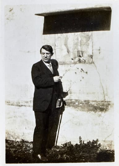 Original photograph depicting Pablo Picasso in the spring of 1917 at the Casa di Marco Lucrezio in Pompeii, holding a twig, in front of a wall on which there is a Pompeian fresco.