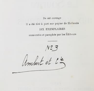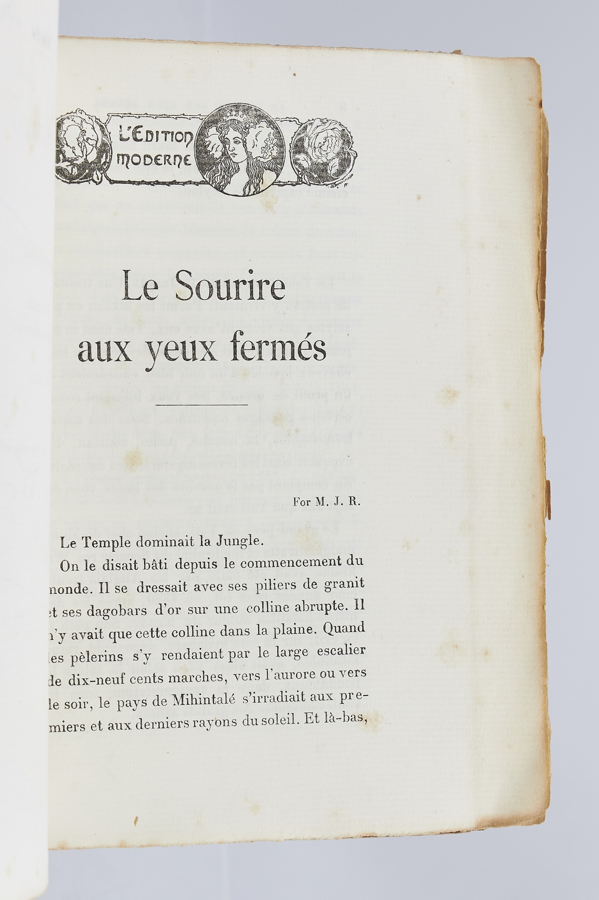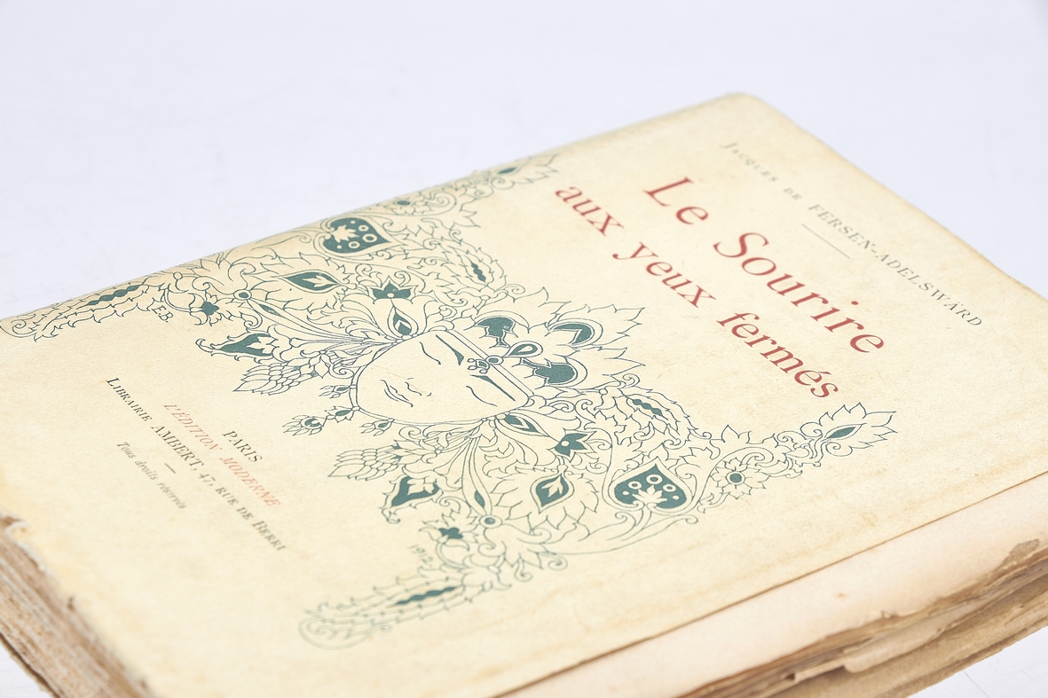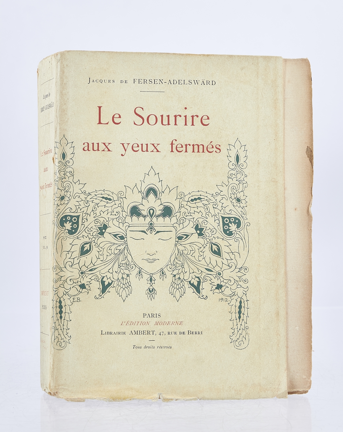 First edition, one of 10 copies signed and numbered by the publisher on hollande paper, the only grand papier (deluxe) copies. Small tears and minute losses of paper to the margins of the soft cover, a repaired joint at foot, some foxing. Untrimmed copy with wide margins slightly bent. Cover illustrated by Ernest Brisset. Inscribed copy, signed and dated by Jacques d'Adelswärd-Fersen to bookseller and publisher Léon Michaud : "... prince of the artist publishers." Extremely rare.