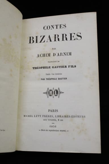 Edition originale de la traduction française établie par Théophile Gautier fils. Reliure en demi veau bronze, dos lisse légèrement passé orné d'arabesques romantiques dorées, plats de papier marbré, gardes et contreplats de papier à la cuve, tranches mouchetées, deux coins légèrement émoussés, reliure de l'époque. Introduction de Théophile Gautier. Quelques petites rousseurs sans gravité.