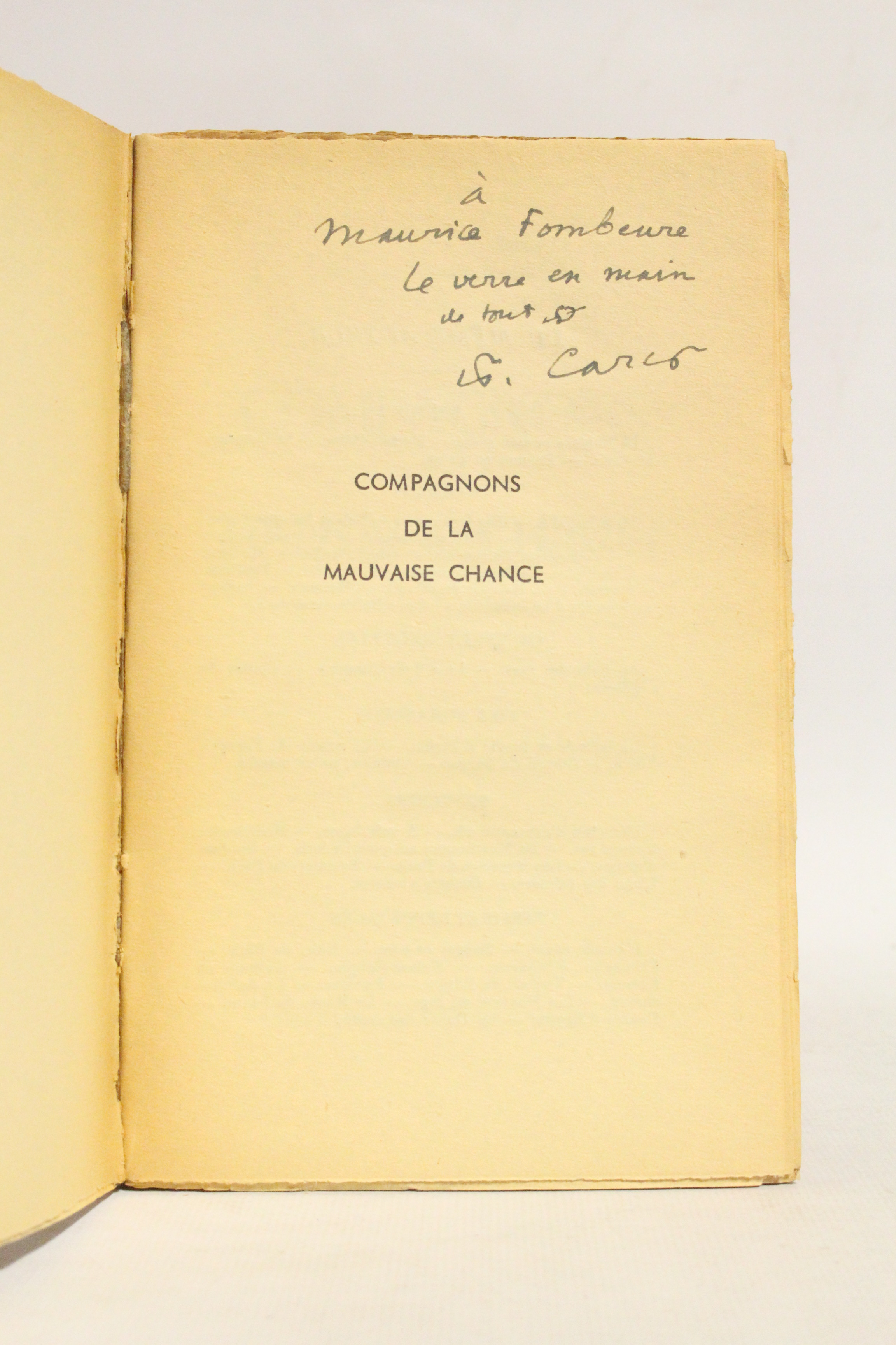 First edition, review copy. Signed autograph Francis Carco: "A Maurice Fombeure, glass in hand Wholeheartedly (a little drawn heart)." Débrochant first guard, tearing ahead of the last guard.
