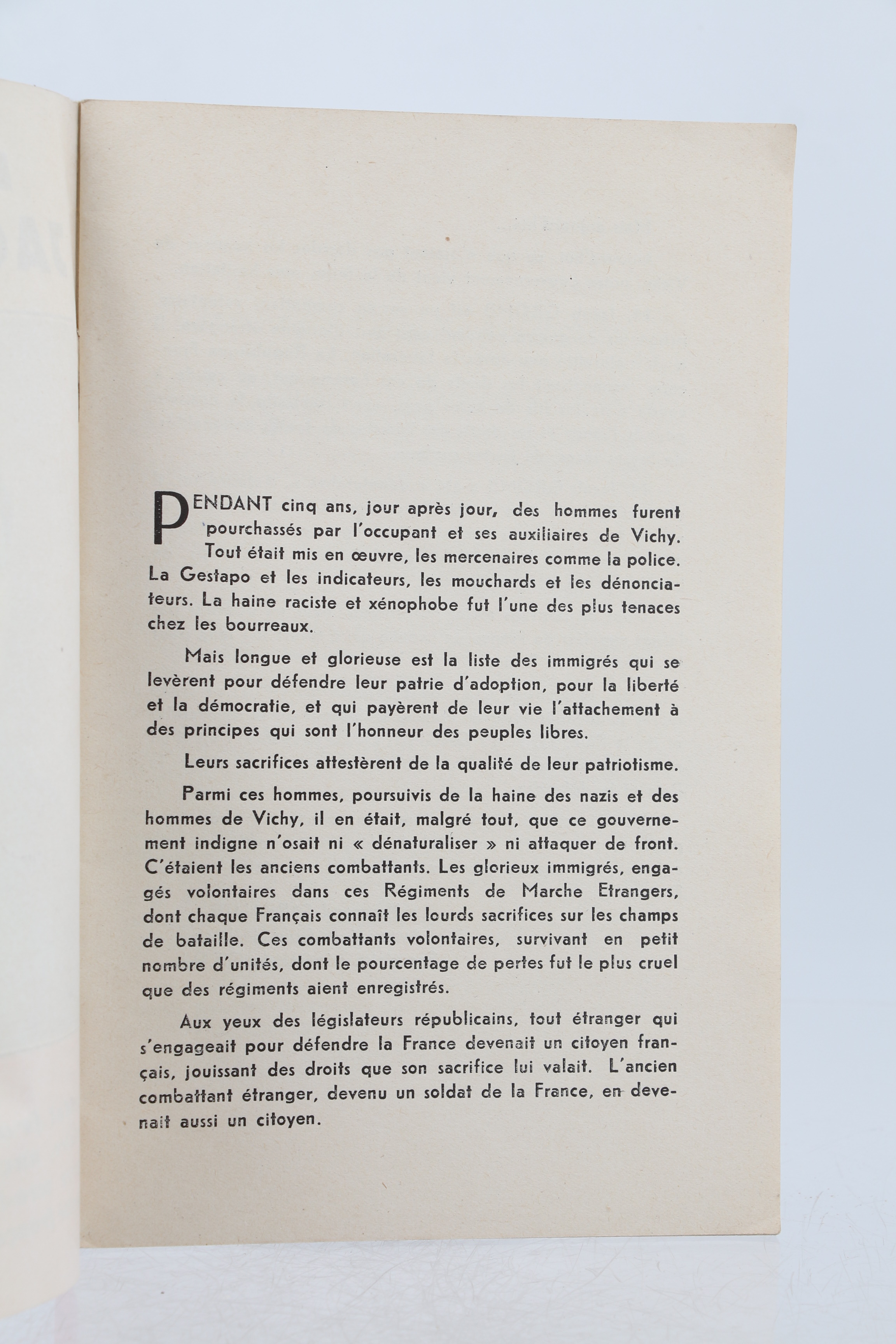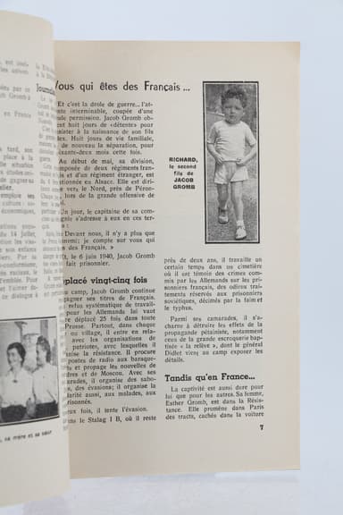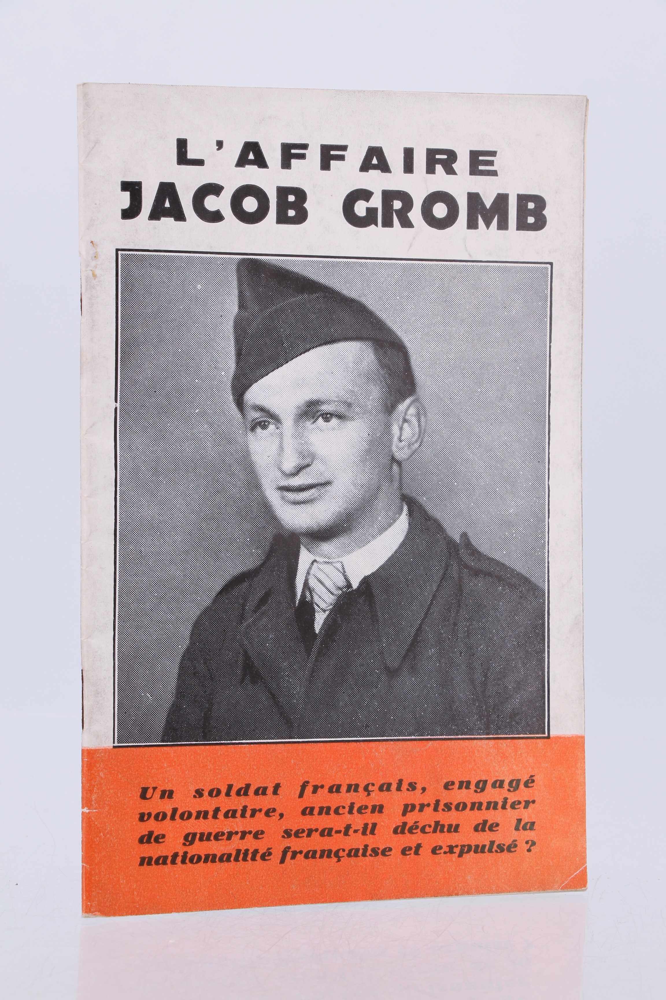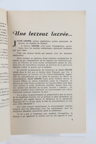 Edition originale illustrée de photographies. Rare et vibrante publication du Comité français de défense des immigrés prenant la défense de Jacob Gromb, engagé volontaire, résistant et prisonnier de guerre, naturalisé français en 1948 puis déchu de sa nationalité et menacé d'expulsion : "Le gouvernement français frappe un patriote : Jacob Gromb. Après lui avoir retiré la nationalité française, il veut l'expulser. Le cas de Gromb n'est pas un cas isolé. Il s'intègre dans la politique générale du gouvernement qui s'attaque aux patriotes français et immigrés qui ont versé leur sang pour la libération de notre sol."