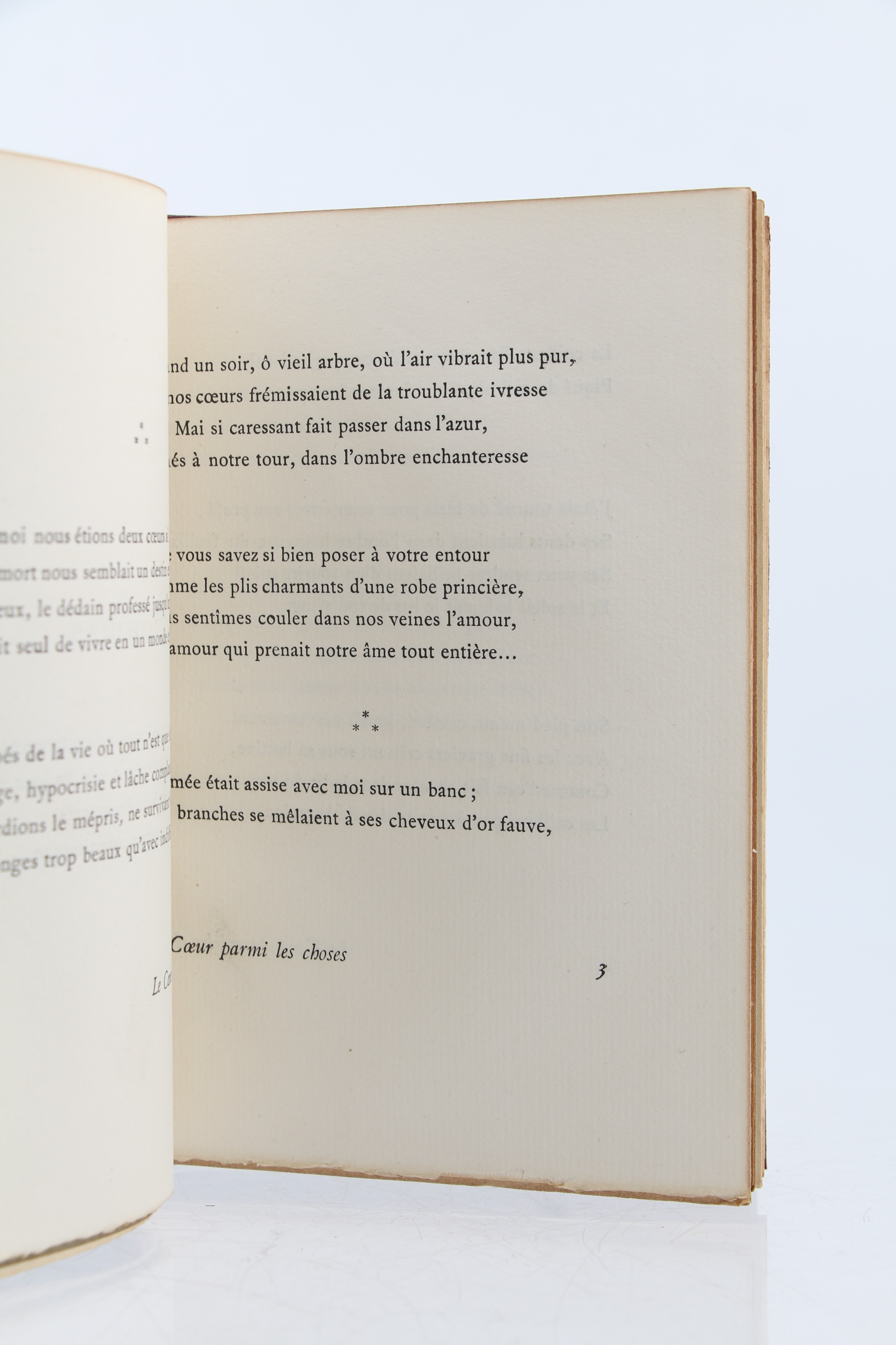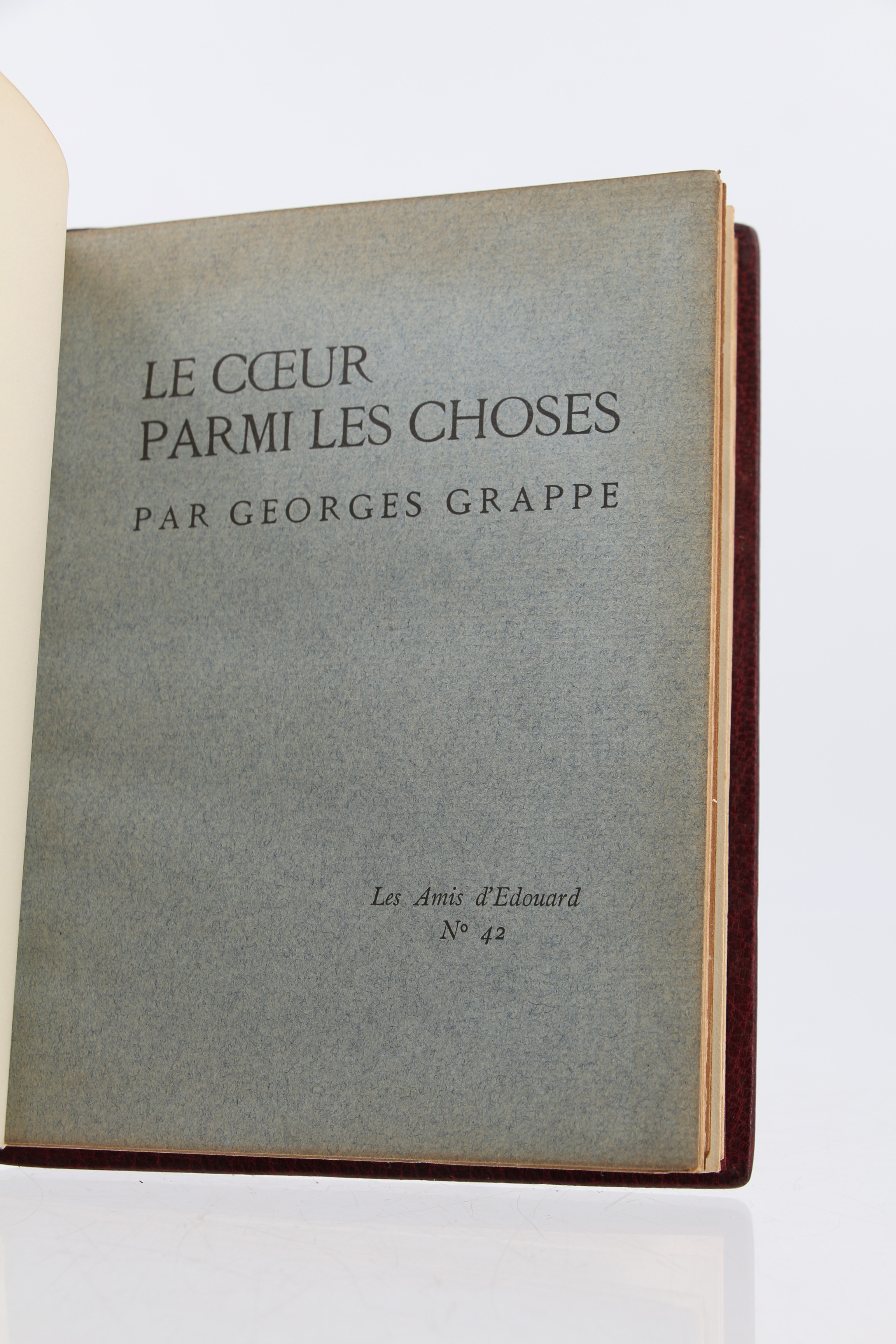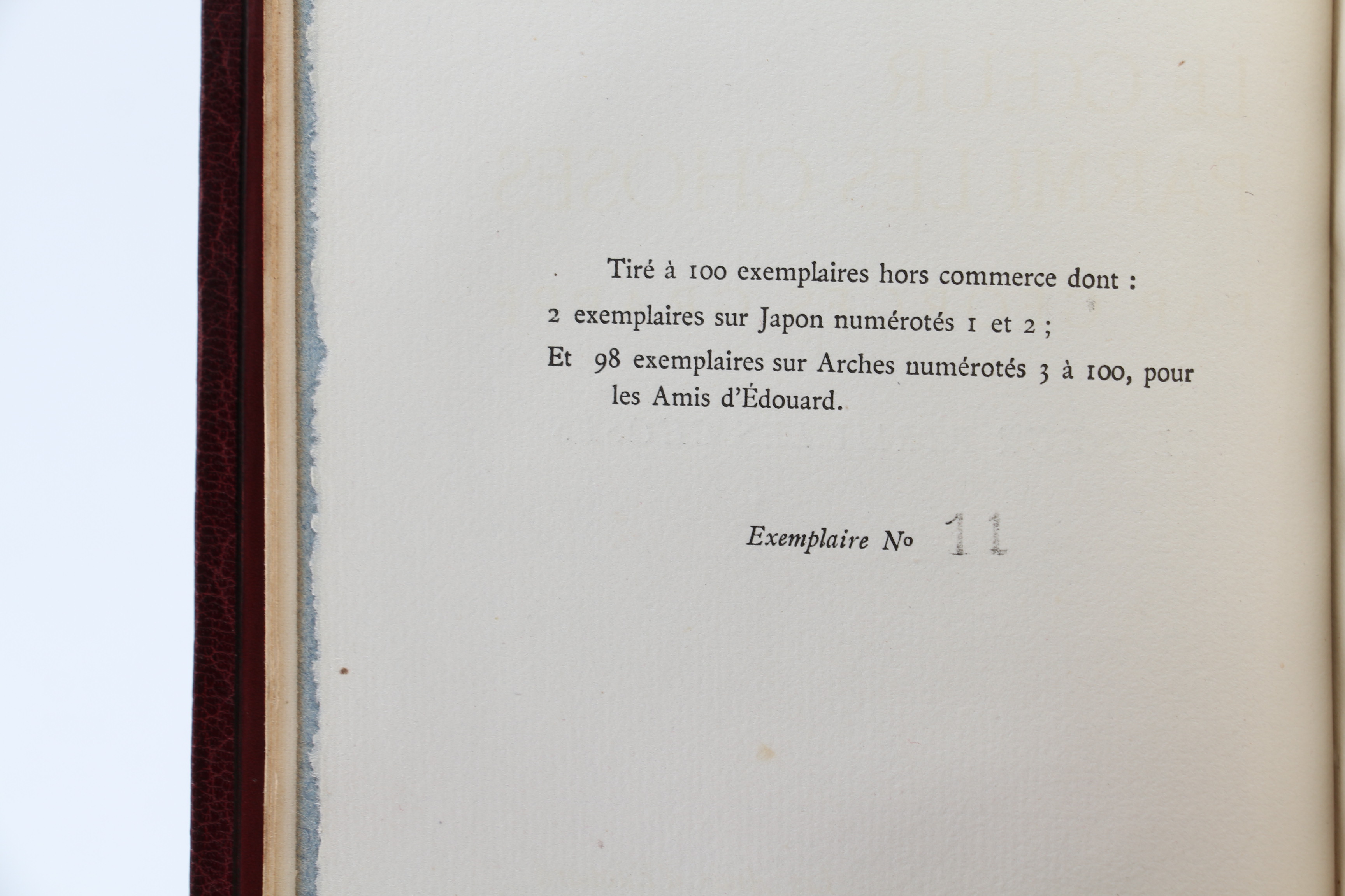 First edition printed in 100 copies, ours numbered on Arches paper. Full burgundy morocco binding, spine with 6 raised bands decorated with gilt fillets, gilt letters and collection number at head and foot, turn-ins lined with burgundy box calf and morocco frame, endpapers lined with burgundy box calf, covers and spine preserved, top edge gilt with deckled edges, binding signed Charles Benoit. Handsome copy perfectly executed.