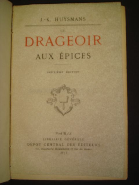 First edition, in re-sale covers, printed in 300 justified copies with false mention of the second edition, as usual. Contemporary Bradel binding of half grey cloth, spine (very lightly faded) with a gilt fleuron, date and double gilt fillet to foot, red shagreen title label (a little rubbed at edges), covers preserved, ex libris inside upper cover. Rare autograph inscription signed by Joris-Karl Huysmans on this work. Endpapers lightly sunned at edges, otherwise a good copy.