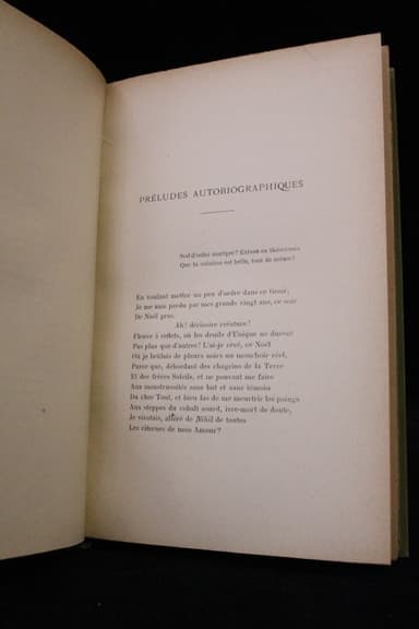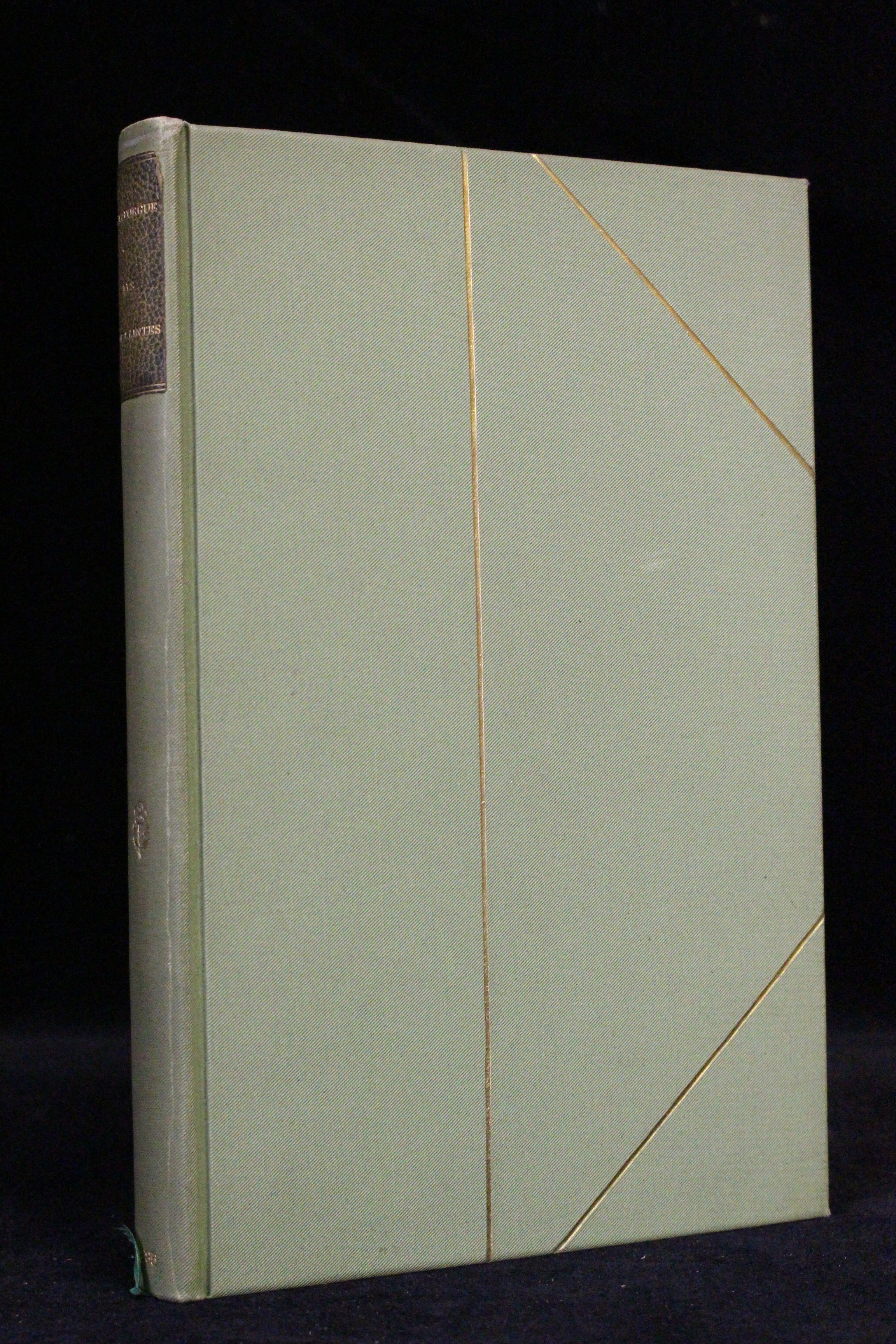 First edition printed in 511 copies. Contemporary Bradel binding of almond-colored cloth by Vermorel, the spine with a gilt floral motif, gilt date to foot, green morocco title label, gilt fillet frame to covers, endpaper and pastedowns of floral paper. A good copy of the first work by Jules Laforgue in a charming contemporary binding.