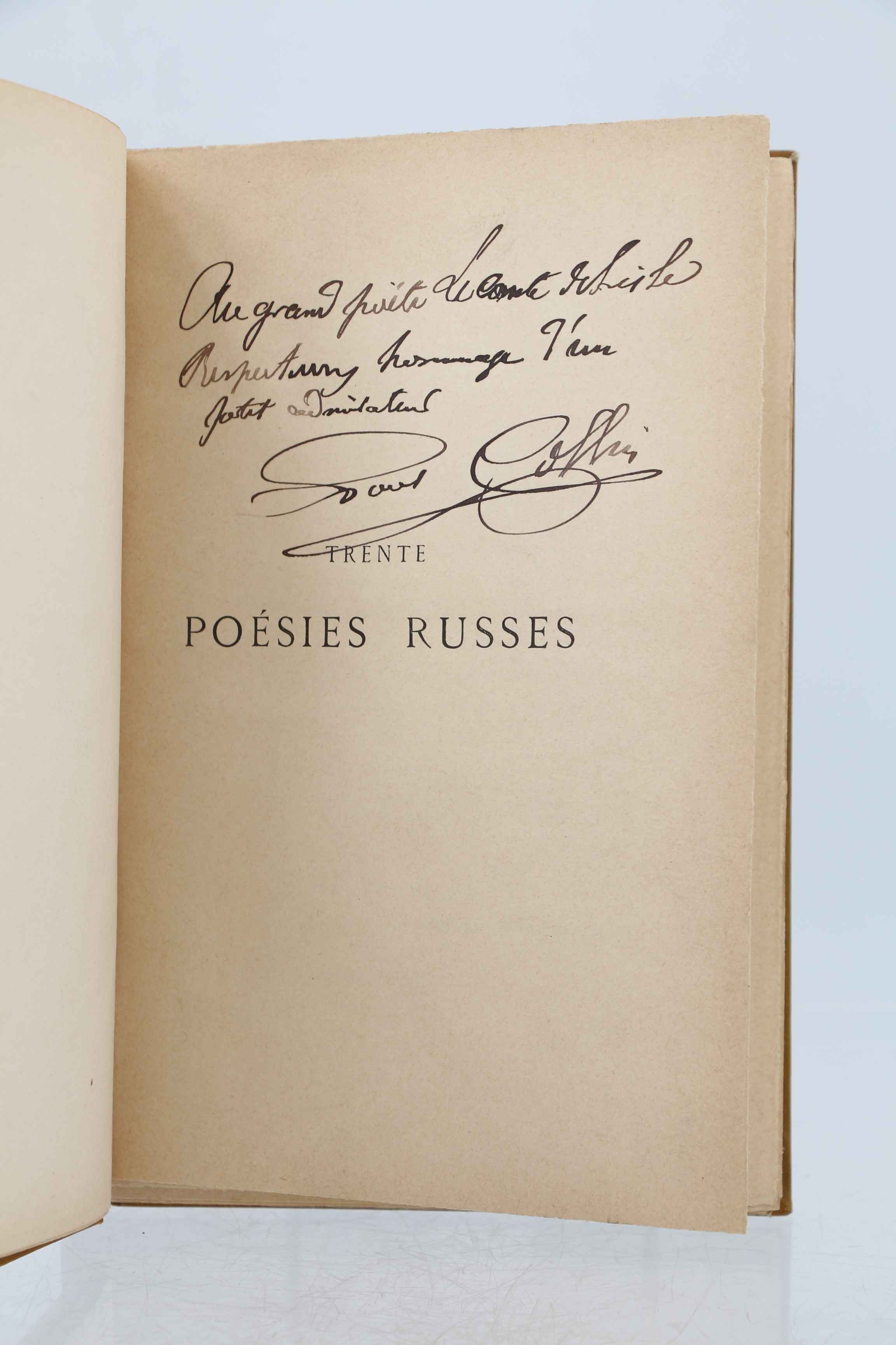First edition of this anthology of Russian poetry presented by P. Collin, of which no deluxe copies were issued. Bradel binding in full saffron cloth, smooth spine decorated with a gilt floral motif, date at foot, saffron shagreen title-label with a small trace of rubbing, contemporary binding. Precious autograph inscription signed by Paul Collin: "Au grand poète Leconte de Lisle respectueux hommage d'un admirateur." (To the great poet Leconte de Lisle respectful homage from an admirer.)