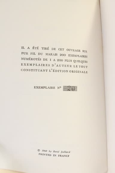 First edition, one of 200 numbered copies on pur fil du Marais paper, the only deluxe copies along with some hors commerce copies also on pur fil du Marais paper. Handsome copy despite two small tears at the foot of the spine and at the head of the front cover.