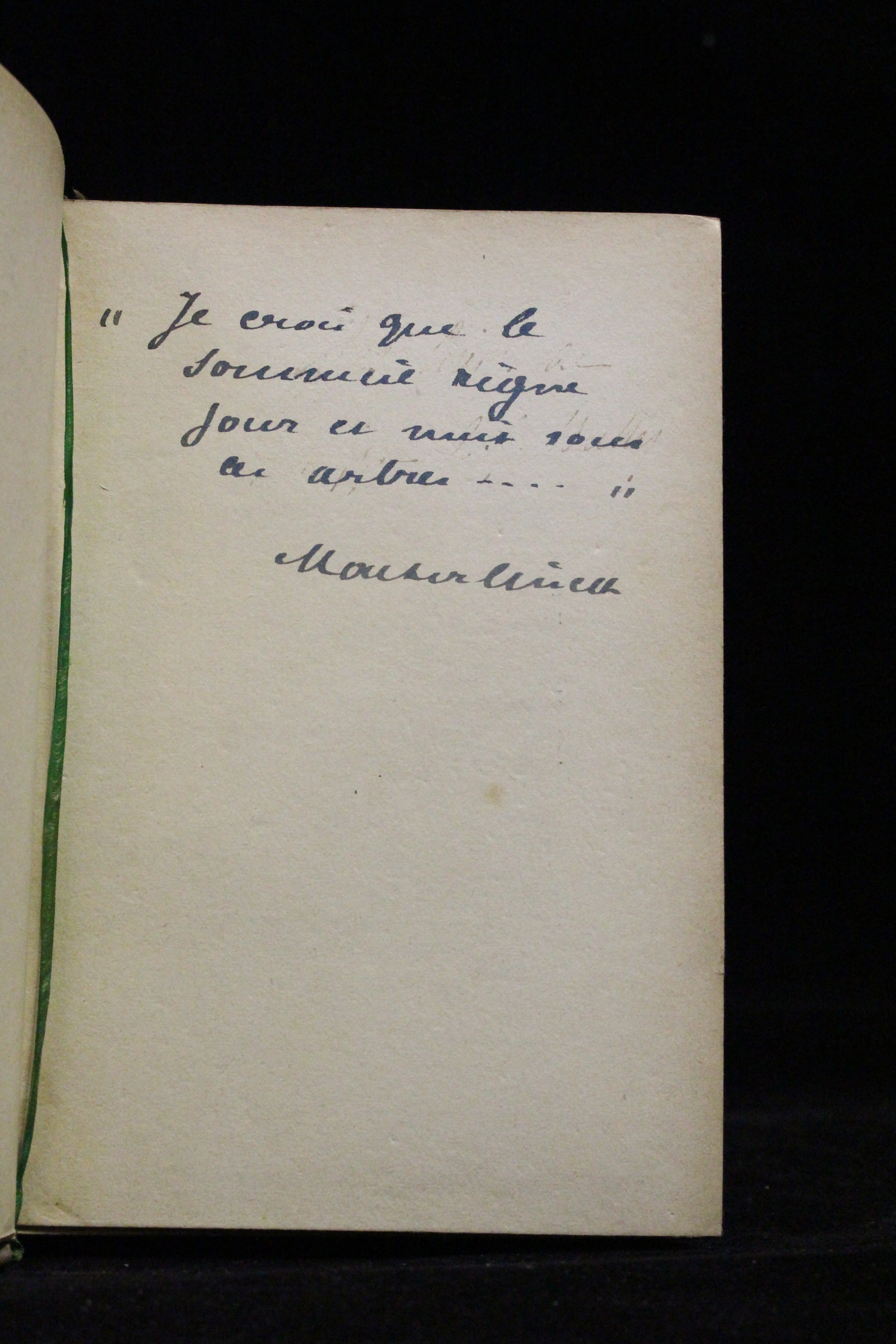 Edition originale sur papier courant, il n'a été tiré que 6 Japon et 35 Hollande. Reliure à rabats en pleine basane, dos à cinq nerfs orné de caisson et de fleurons dorés, contreplat et gardes de papier à la cuve, couvertures conservées, tête dorée sur témoins, reliure dans le goût du XVIIIème siècle. Compositions en noir de Georges Minne. Exemplaire enrichi d'une citation autographe signée de Maurice Maeterlinck sur la page de garde : "Je crois que le souvenir règne jour et nuit sous ces arbres...".