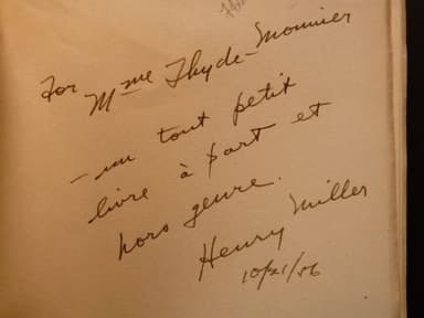 Edition originale bilingue sur papier courant. Précieux envoi autographe signé d'Henry Miller à Thyde Monnier. Ex-dono à la plume du dédicataire sur le premier plat. Légers accrocs avec infimes manques marginaux sur le dos et le premier plat, agréable état intérieur. Ouvrage illustré d'un frontispice photographique.