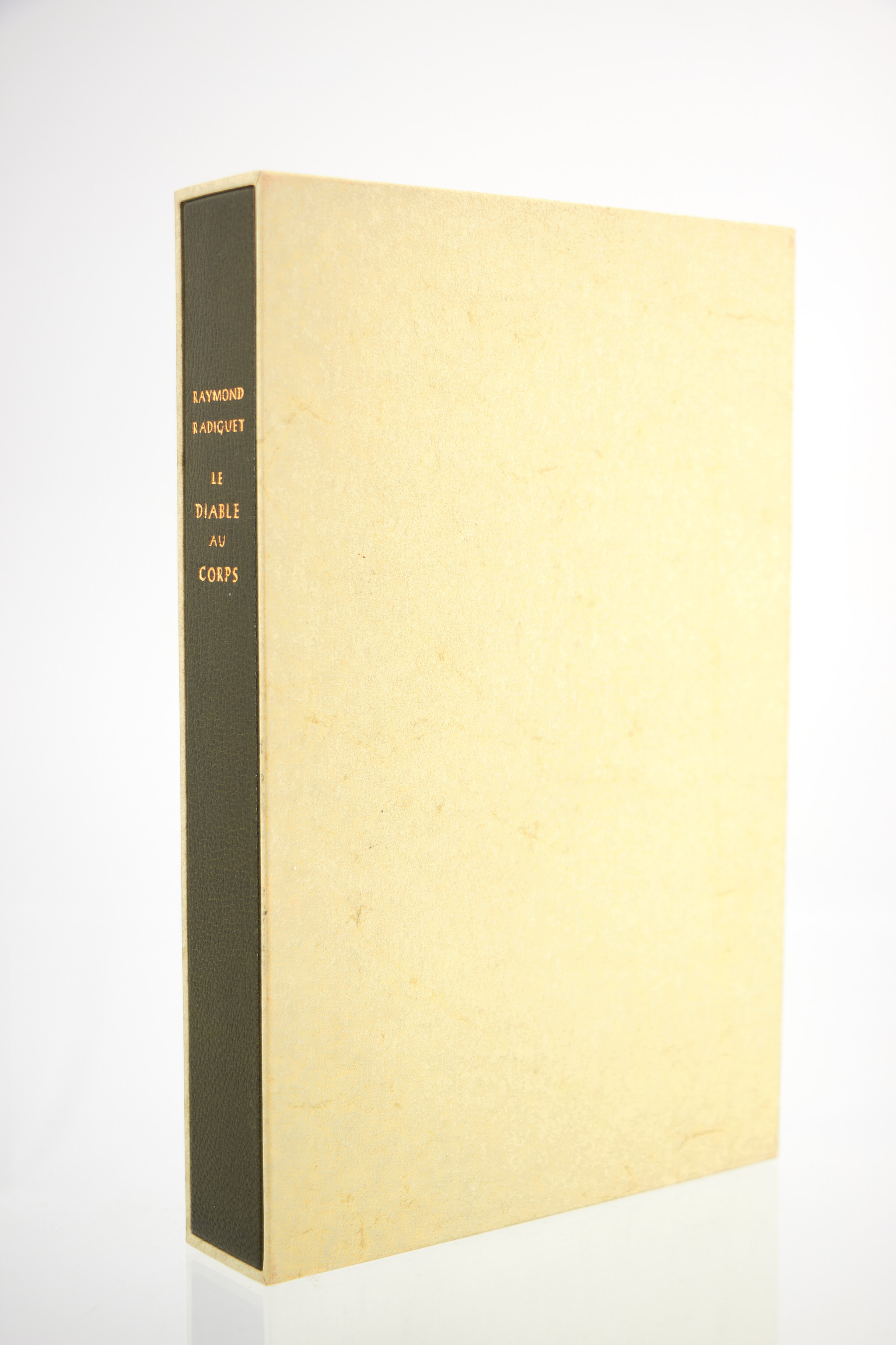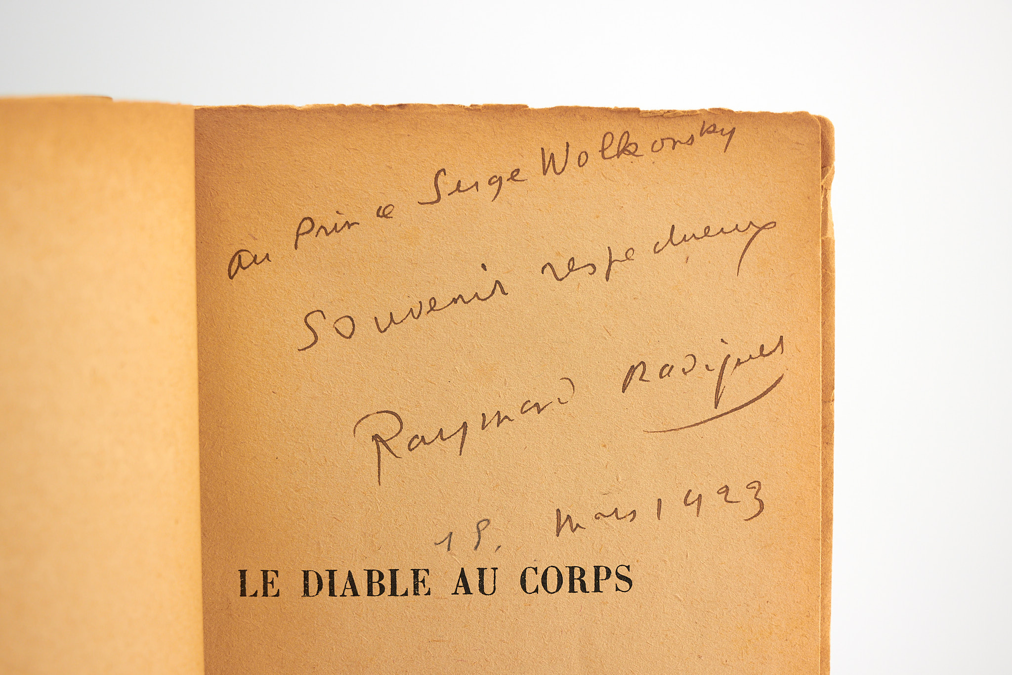 First edition, an advance (service de presse) copy Rare autograph inscription from Raymond Radiguet to Prince Serge Wolkonsky Two repairs to head and foot of spine, covers and spine marginally sunned, paper yellowed, tiny marginal lacks to first endpaper This copy, which retains its advertising notice pasted onto an endpaper, is presented in a chemise and slipcase by Devauchelle: olive morocco spine, aniseed-colored paper boards, lined with olive felt Prince Serge Wolkonsky was the director of the Bolshoi theater and a friend of his compatriot, Diaghilev.
