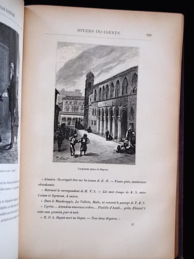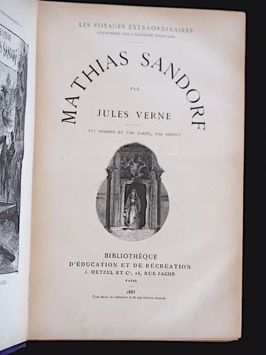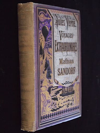 Illustrated Edition. 111 drawings by Bennett and card. Catalog ultimately for the year 1886. Cardboard editor connected by Lenègre; special plaque by Souze. Cardboard told the silvery banner, or the ball to the rare purple. The cardboard was used only for the triple volume Sandorf. Beautiful first plate, the external beveled brod cleared. spine uniformly irradiated. A cut in the rear of the upper joint of 2cm. Second course with small white spots. Bottom right hand corner blunt. Good condition inside without freckles. Despite the obvious defects, desirable copy for its beautiful color combination, silver on a purple background. Sandorf is dedicated posthumously to Alexandre Dumas. Jules Verne tribute indeed in this novel the author of the Count of Monte Cristo ("In this book, I tried to Matthias Sandorf the Monte Cristo Extraordinary Voyages."); Sandorf was imprisoned and betrayed like him and his adventures retrace his revenge. The novel is set in the Mediterranean region of southern Europe.