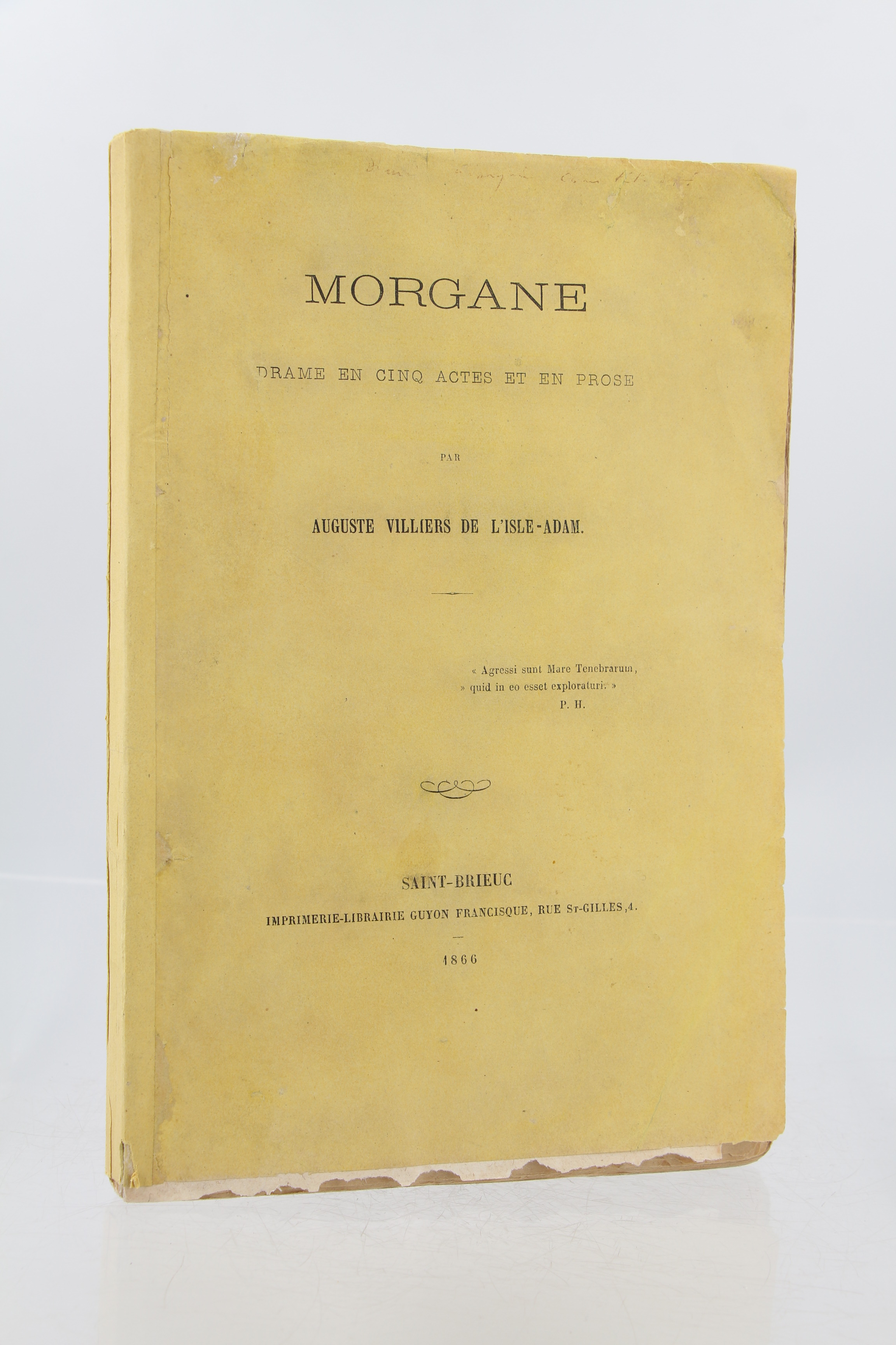 First edition, hors commerce, printed in a small number of copies and of which there were no large paper copies. Autograph inscription signed by Auguste Comte de Villiers de l'Isle-Adam. Imitation spine skillfully remade to match covers, small angular tears and marginal restored lacks to covers, the occasional internal wormhole.