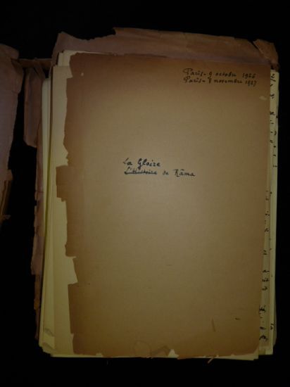 Manuscrit autographe complet et inédit signé de 176 pages in-folio rédigées à l'encre noire sur le recto. Double chemise autographes un peu déchirées, la seconde datée Paris - 9 octobre 1926 et Paris - 8 novembre 1927. Nombreuses corrections autographes de l'auteur et titre biffé (initialement, l'Histoire de Râma). Roman inédit d'après le Ramayana, poème épique sanscrit ancien.