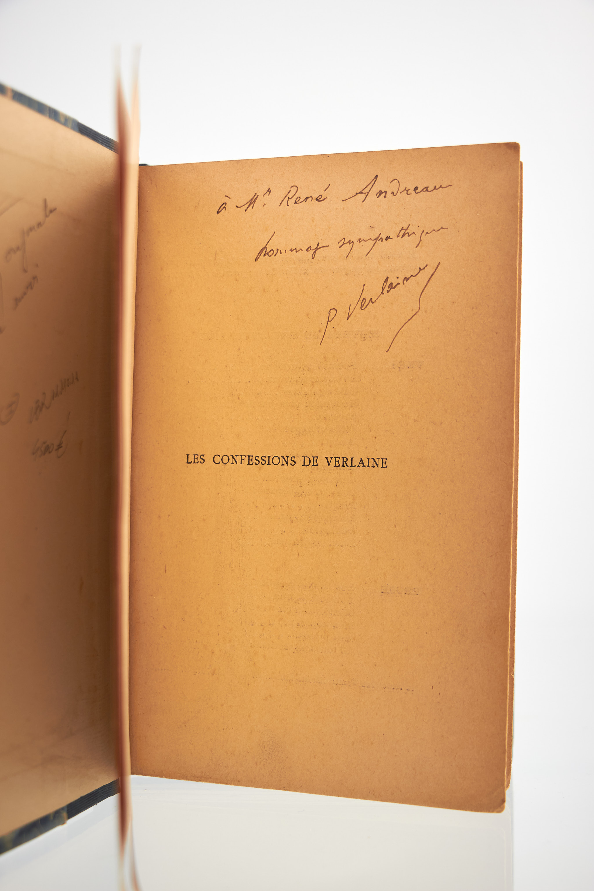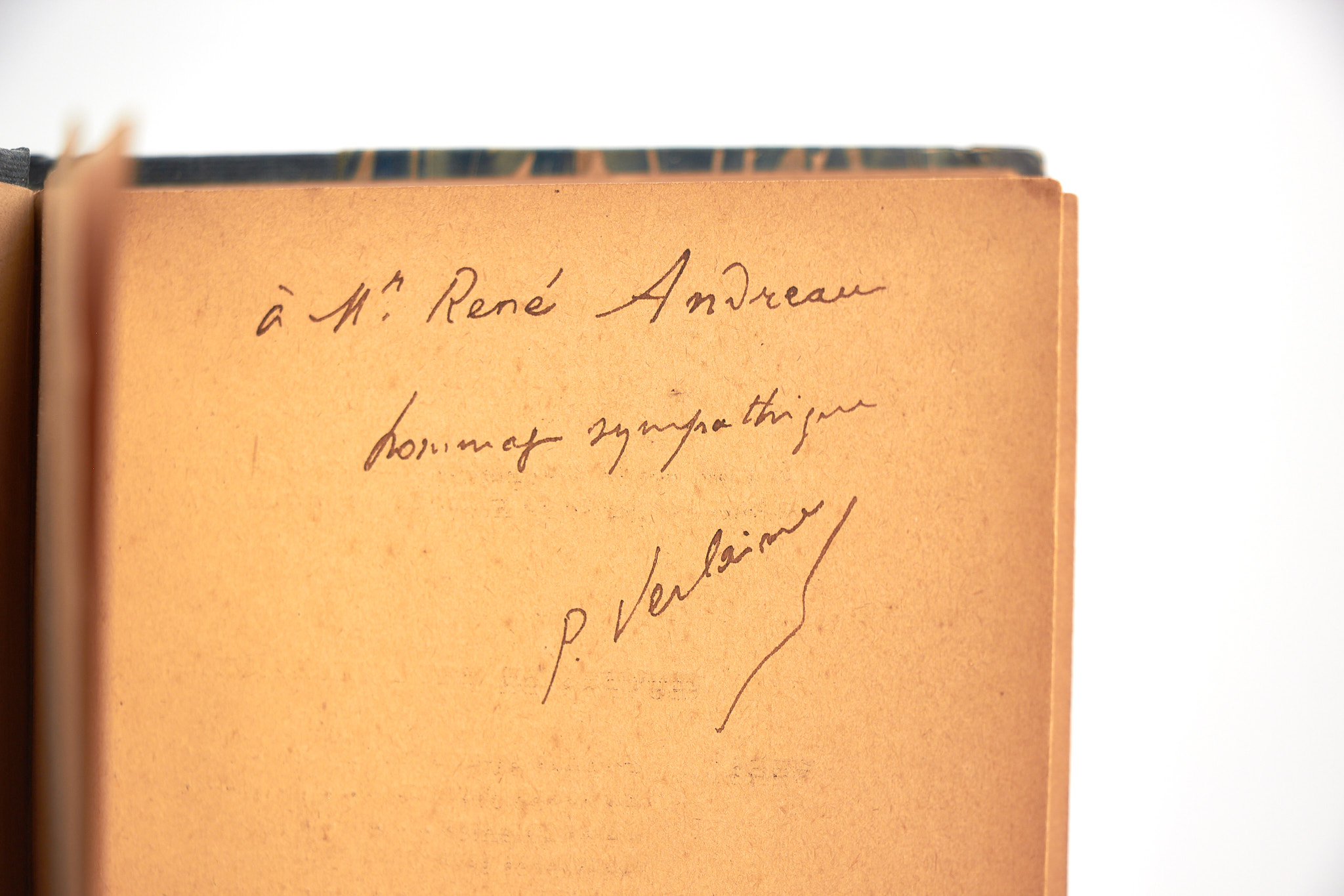 First edition Dark green half cloth Bradel binding over marbled paper boards, gilt floral motif to spine, double gilt fillet at foot Autograph inscription from Paul Verlaine to René Andreau With a frontispiece portrait of the author by Louis Anquetin.