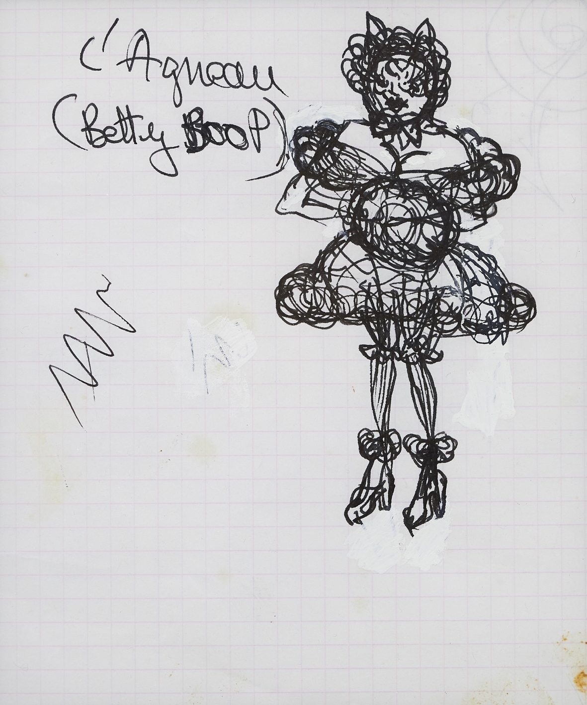 All CollectionsOriginal drawing by Manfred Thierry Mugler, in fine black felt pen with correction fluid alterations, on a gridded paper leaf. Next to the figure, Mugler inscribed "L'Agneau [The Lamb] (Betty Boop").