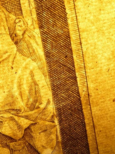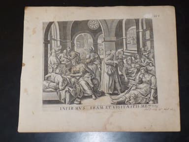 Original unsigned engraving, presumably executed with burin after a 16th-century painting by Maarten de Vos (or Martin). Proof on watermarked laid paper, work of early 17th century. This is an illustration of the Gospel according to Matthew 25.36, "I was sick, and you visited me". Latin caption in the lower portion of the engraving. Numbered notation "6" in the lower right corner within the engraving, and manuscript notation "114" in the margin in the upper right corner. An old manuscript annotation in Greek characters below the right corner of the plate mark. Watermark visible by transparency. Rare and minimal foxing and stains mainly marginal, one tiny corner loss, otherwise very fine condition for this extremely rare engraving of great freshness. Maarten de Vos (or Martin), Antwerp 1532-1603, was a Flemish painter. He was a pupil of Frans Floris, then completed his training with Tintoretto. He is credited with historical paintings in the Mannerist style, notably a 'Saint Paul Bitten by a Viper on the Island of Malta' (1568) which is in the Louvre Museum in Paris.