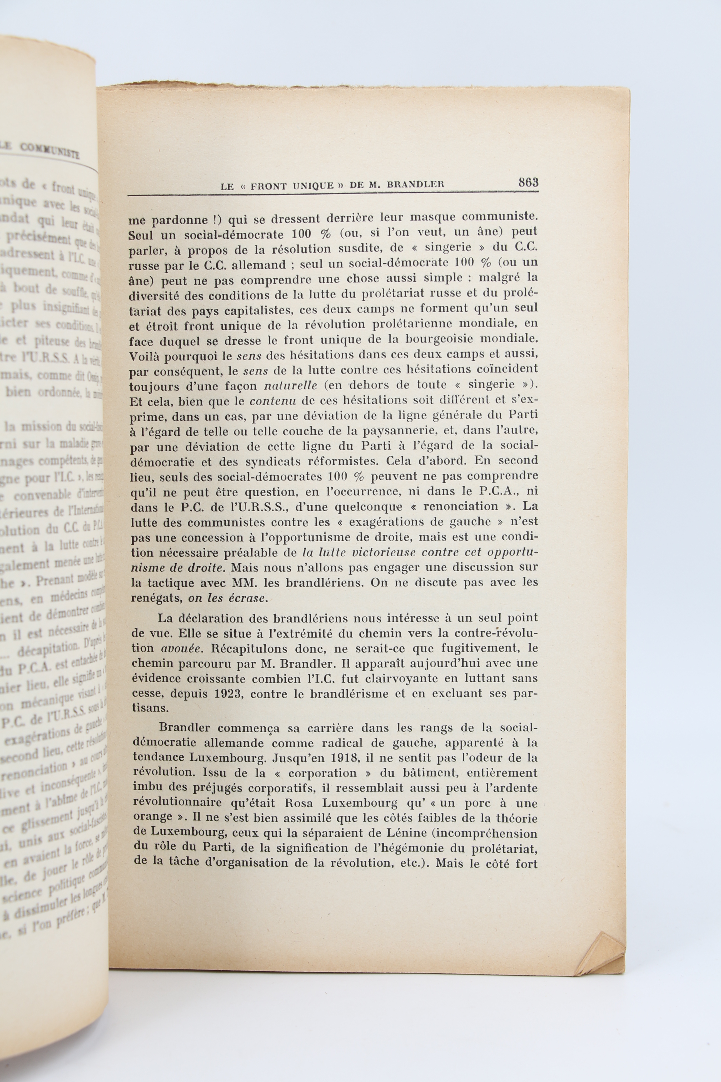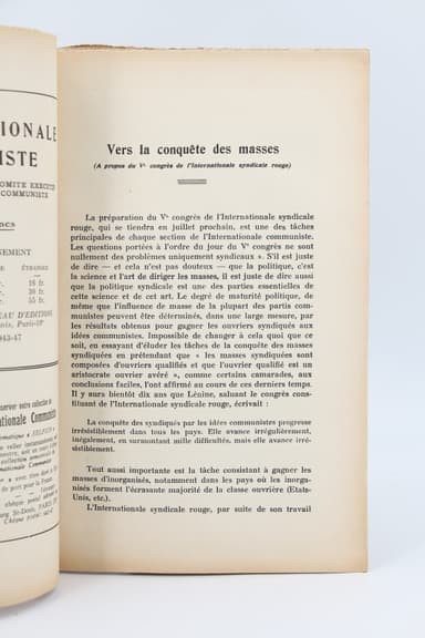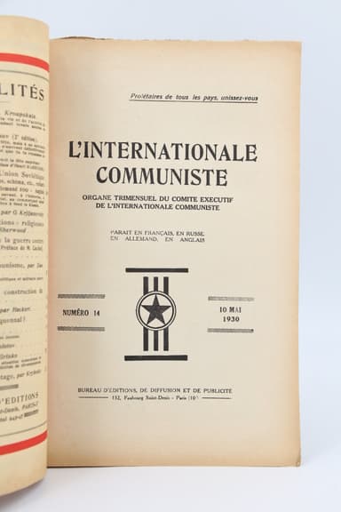 First edition. Number 14 contains the following articles: "Vers la conquête des masses", "Le "Front unique" de M. Brandler", "La ligue pour la libération de l'Ukraine" by N. Skrypnik, "Le parti communiste et le travail parmi les paysans" by G. Gold, "Le bilan du 6 mars et la lutte pour la conquête de la majorité de la classe ouvrière", "Le 6 mars aux Etats-Unis", "La presse communiste internationale et le 6 mars" by Fogorasi. Rare and handsome copy.