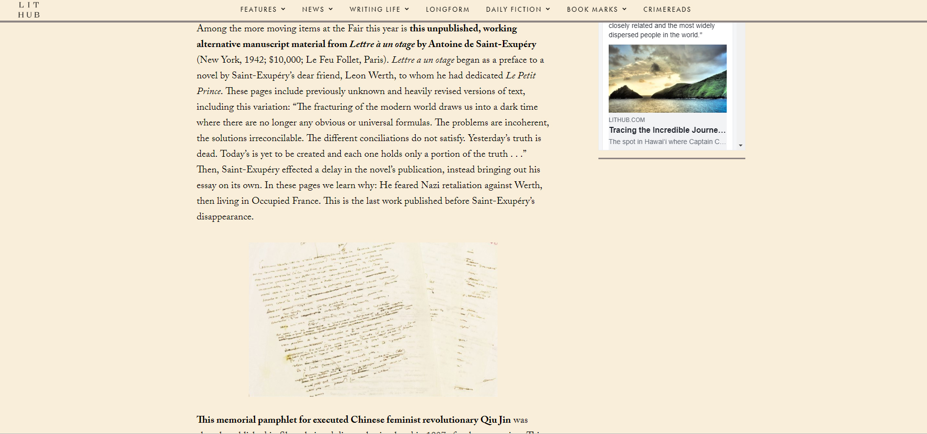 "Parmi les objets les plus émouvants de la foire cette année figure ce manuscrit inédit et alternatif de travail de Lettre à un otage d’Antoine de Saint-Exupéry (New York, 1942 ; 10 000 $ ; Le Feu Follet, Paris). Lettre à un otage a commencé comme une préface à un roman de l'ami cher de Saint-Exupéry, Léon Werth, à qui il avait dédié Le Petit Prince.