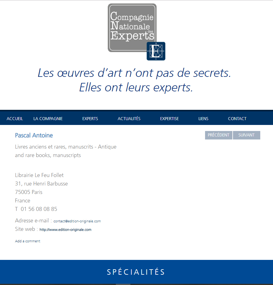 Il est désormais expert auprès de la CNE dans la catégorie Livres Anciens et Rares et Manuscrits.