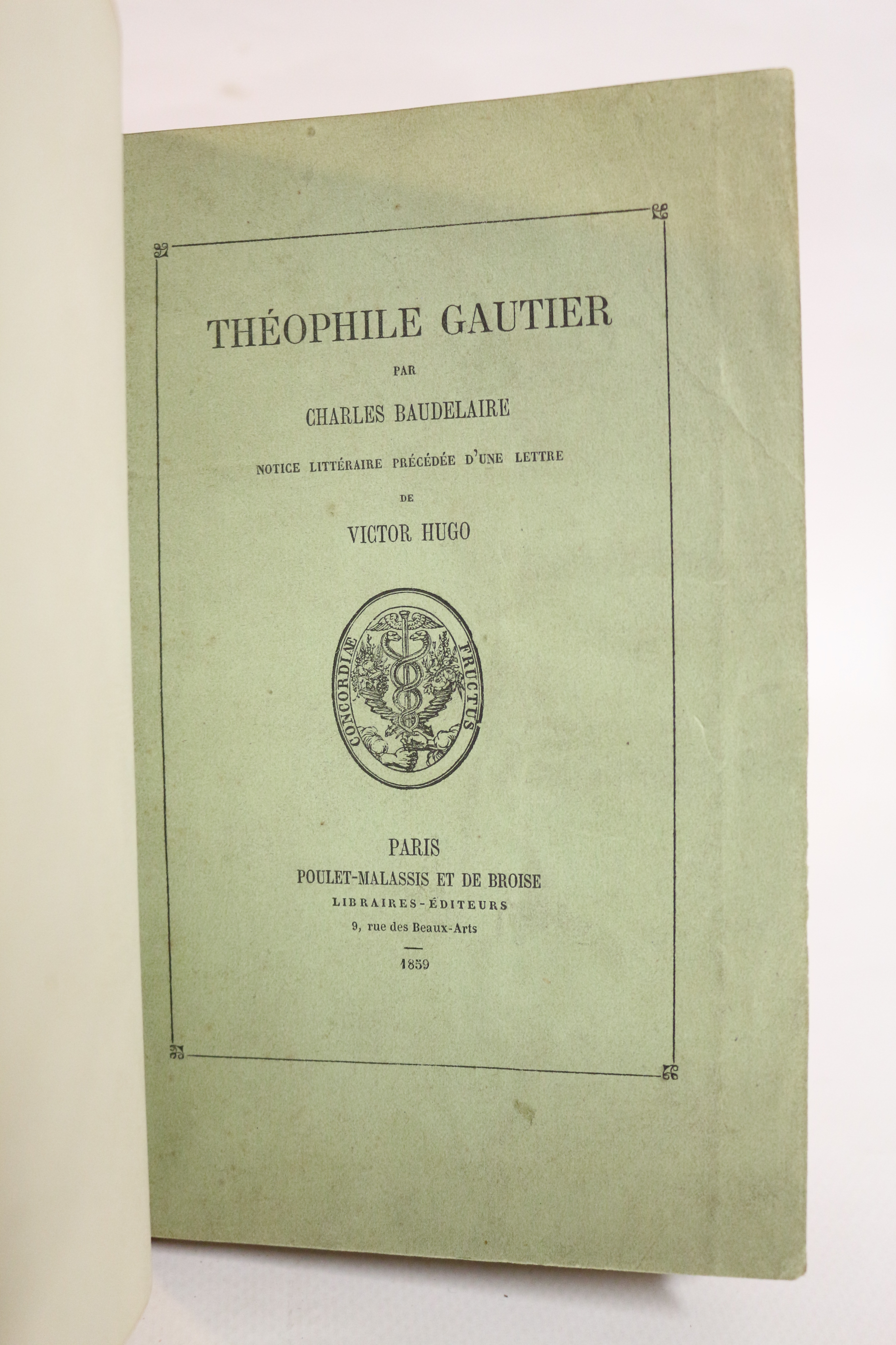 Charles BAUDELAIRE & Victor HUGOThéophile Gautier. Notice littéraire précédée d'une lettre de Victor Hugo.Poulet-Malassis et de Broise, Paris 1859, 11,5x18cm, relié.