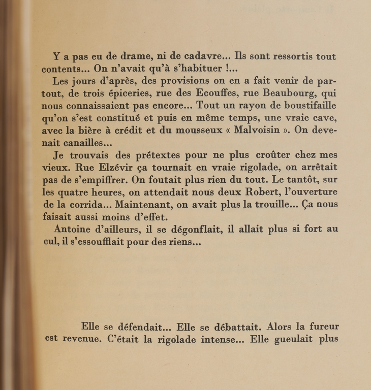 Cette double page centrale grélée de trous suffisant à produire l'effet désiré, les "censures" disparaissent ensuite complètement, comme si Denoël n'avait plus rien à reprocher au style de son poulain dont l'art pouvait à nouveau et impunément reprendre ses droits.