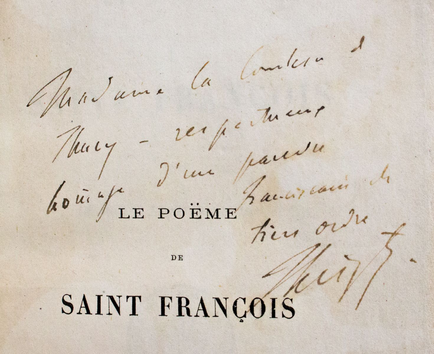 « Madame la Comtesse de Fleury – respectueux hommage d’un pauvre franciscain de tiers ordre ».Cette pieuse dédicace rédigée sur l’ouvrage d’un tiers, sous son apparente humilité toute franciscaine, témoigne en réalité d’une complicité profonde avec cette femme dont la sensualité l’éloigna de la religion et qu’il retrouve trente-cinq ans plus tard dans cette foi commune.