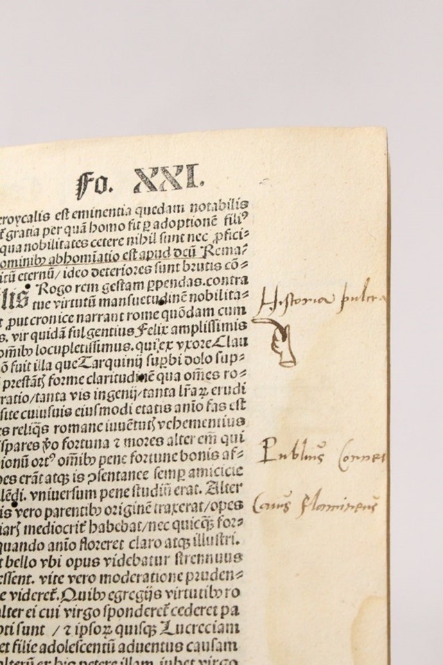 Ce premier marginalia, a priori le plus conjoncturel et le moins nécessaire, trouve ainsi sa place dans l’histoire de l’ouvrage et semble aussi respecté par les collectionneurs successifs que l’annotation savante en marge des premières éditions des Essais de Montaigne.