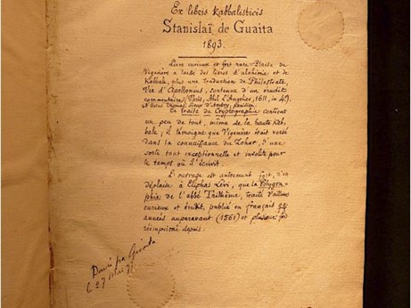 Son niveau d’érudition bibliophilique (la note de S. de Guaita, qui fait office d’ex-libris de son exemplaire du « Traicté des chiffres » est devenu la principale source bibliographique de cet ouvrage de Vigenere)