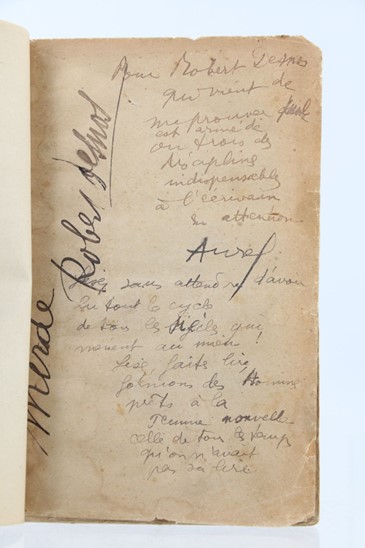 Et bien sûr son avis de lecteur (comme cette Cambronnienne appréciation signée de Desnos sur le livre respectueusement offert par Aurel : « MERDE Robert Desnos »).