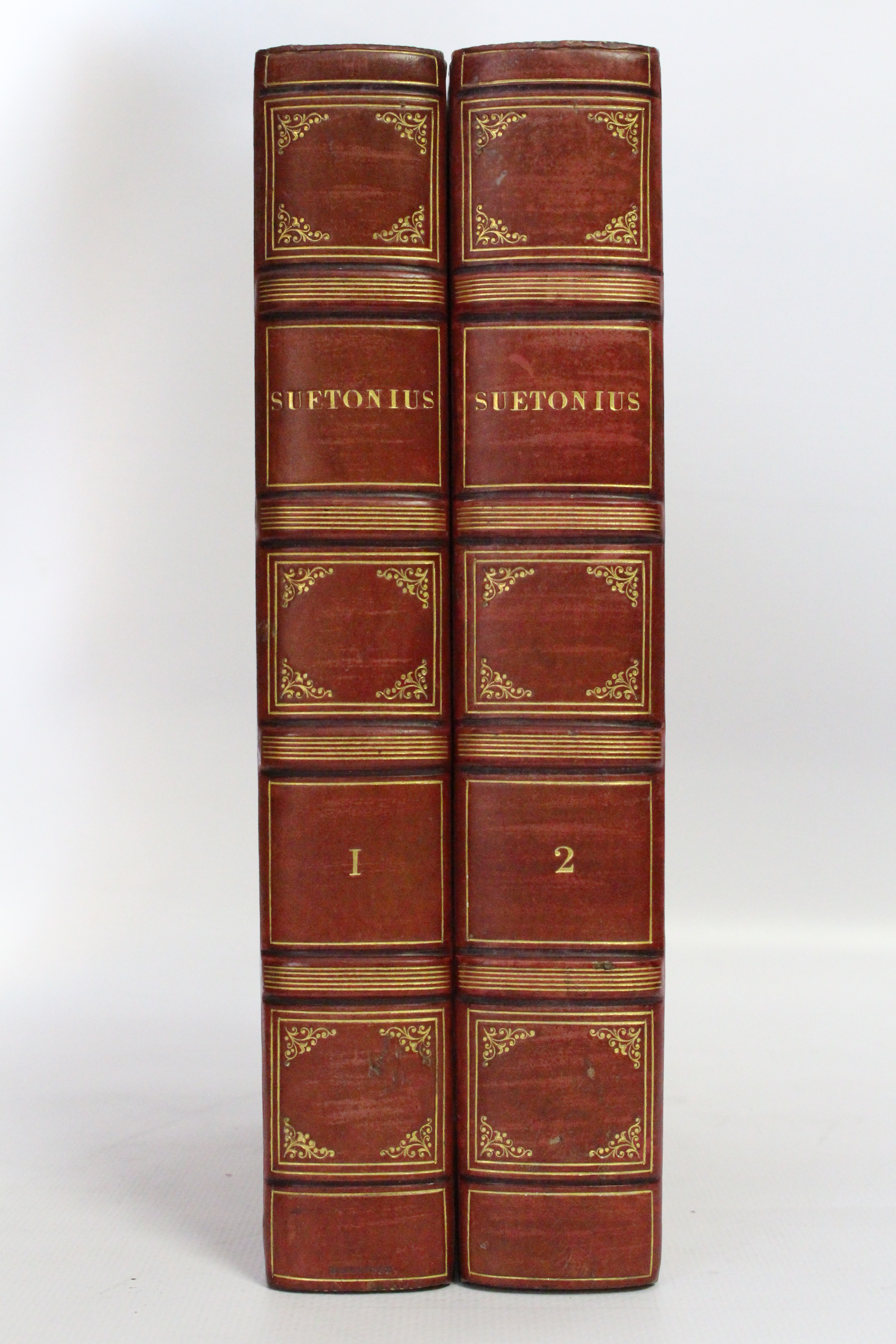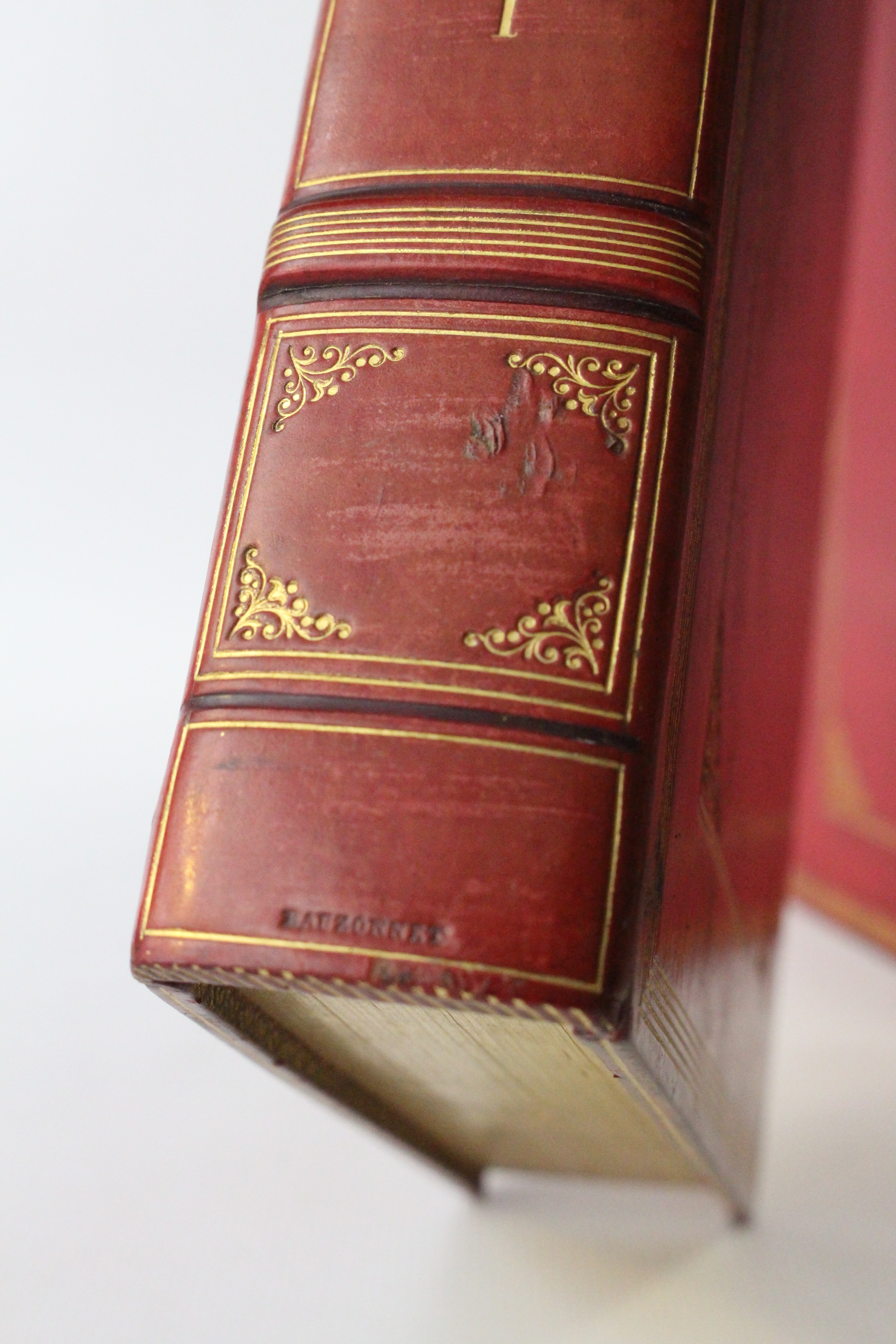 Reliures de l'époque en plein veau cerise, dos à quatre nerfs ornés de filets dorés et à froid et d'arabesques dorées en écoinçons, quintuples et doubles filets dorés en encadrement des plats, arabesques en écoinçons, roulettes dorées sur les coupes et les coiffes, dentelle dorée en encadrement des contreplats, toutes tranches dorées. Reliures signée Bauzonnet.