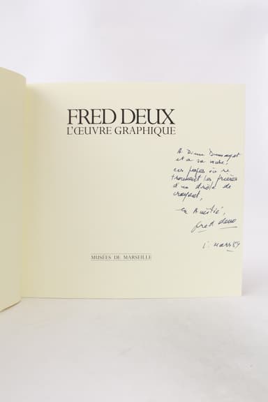 Edition originale de cette plaquette d'exposition s'étant tenue au musée Cantini à Marseille du 27 Février au 30 Avril 1989. Ouvrage illustré de reproductions d'oeuvres de Fred Deux. Premier plat comportant un léger accroc sans gravité en pied. Envoi autographe daté et signé de Fred Deux au journaliste, scénariste et producteur Pierre Dumayet, l'un des pionniers de la télévision française: "... ces pages où se trouvent les prières d'un drôle de croyant."
